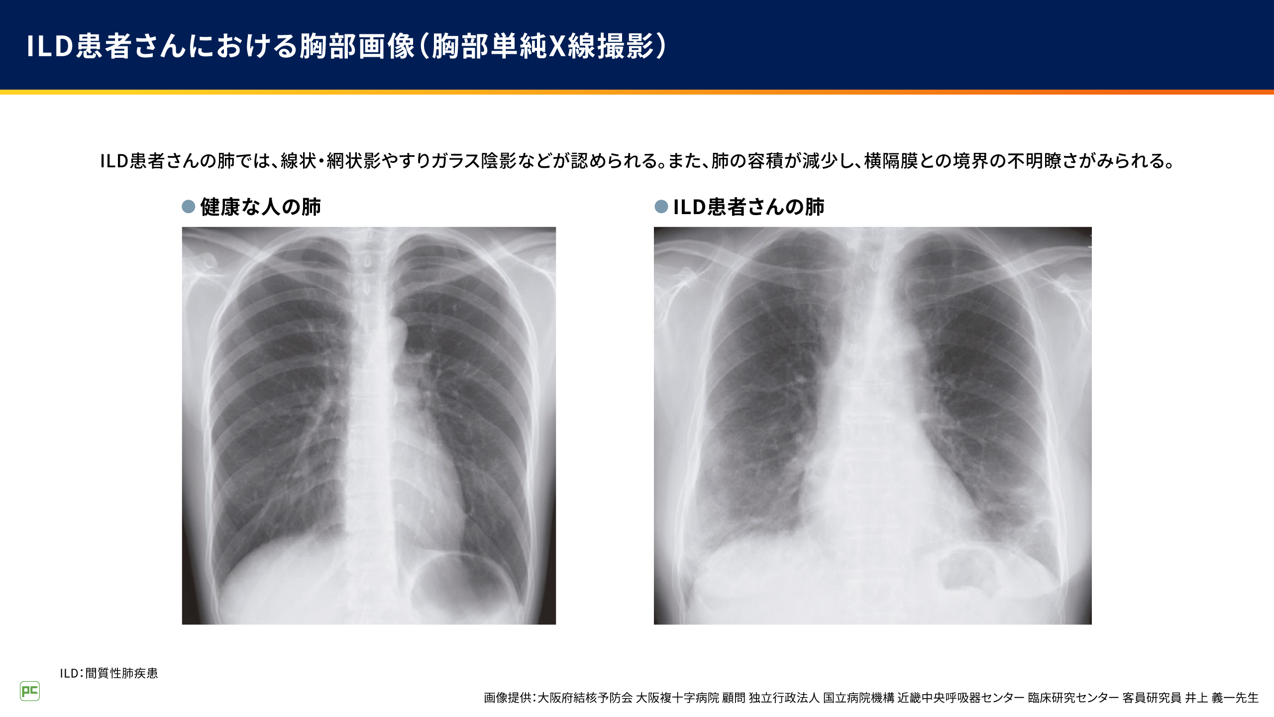● ILDでは胸部X線画像上、線状・網状影やすりガラス陰影などが認められるほか、肺の容積が減少して横隔膜との境界が不明瞭となる