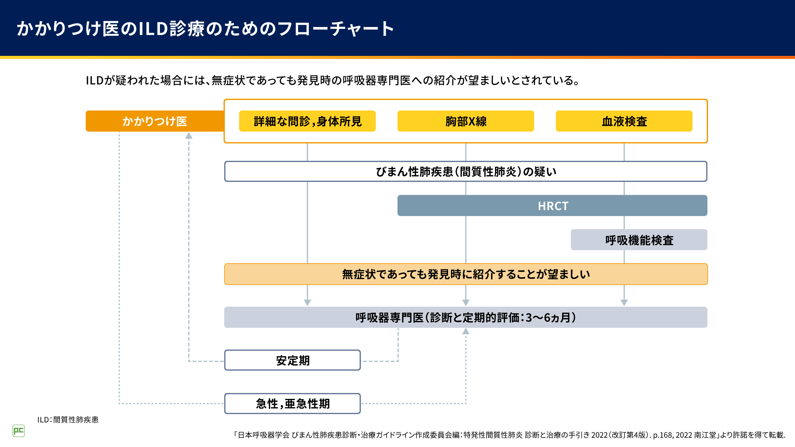 問診での詳細な症状の聞き取りや聴診などの身体検査、胸部X線検査、血液検査の結果からILDが疑われた場合には、専門医に紹介してくださいね。早期の段階ではまだ自覚症状が出現していない可能性があるので、無症状であっても専門医へ紹介することが必要です。
