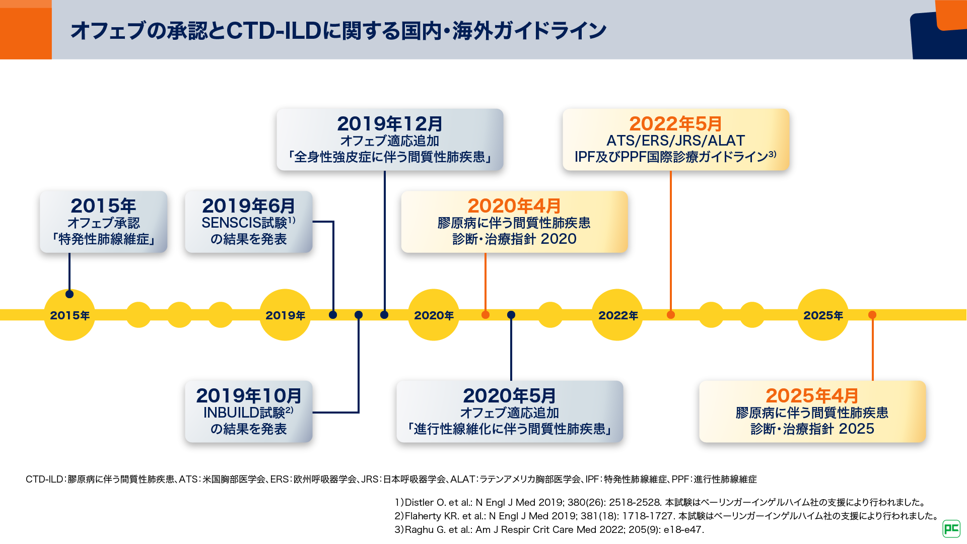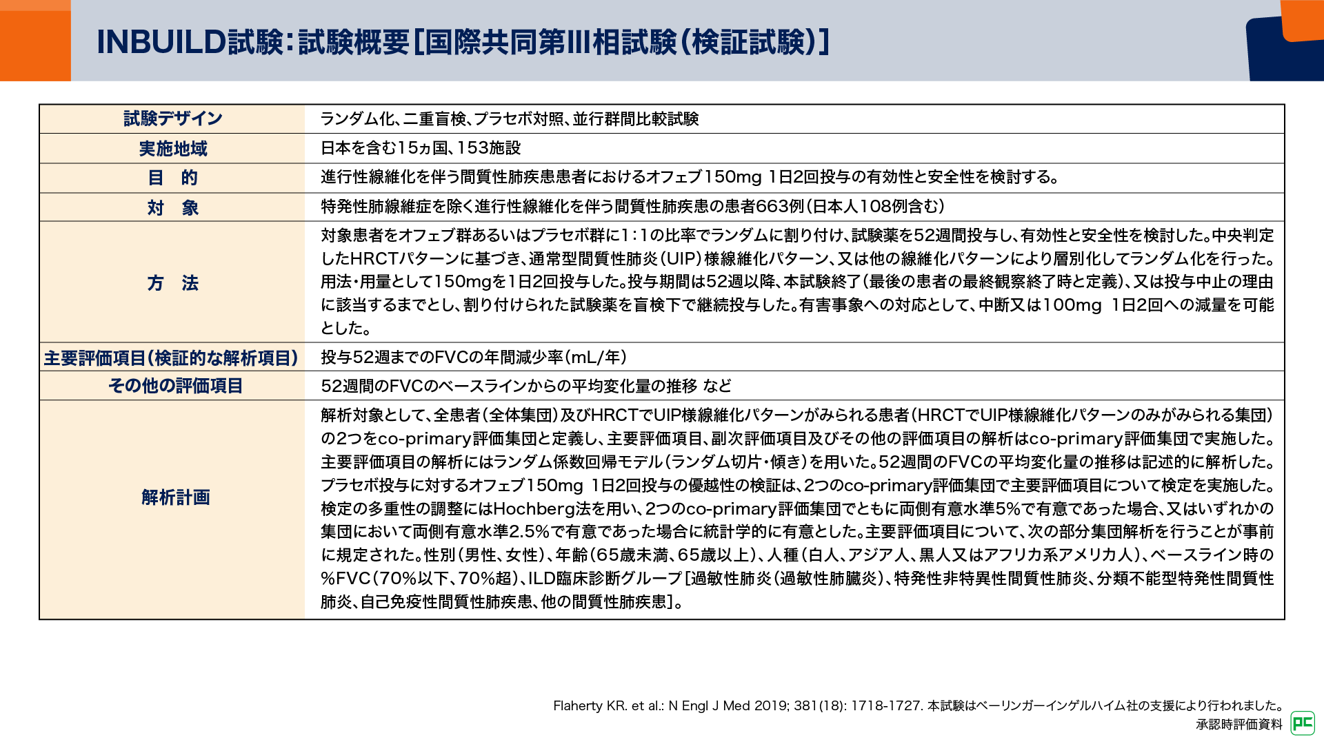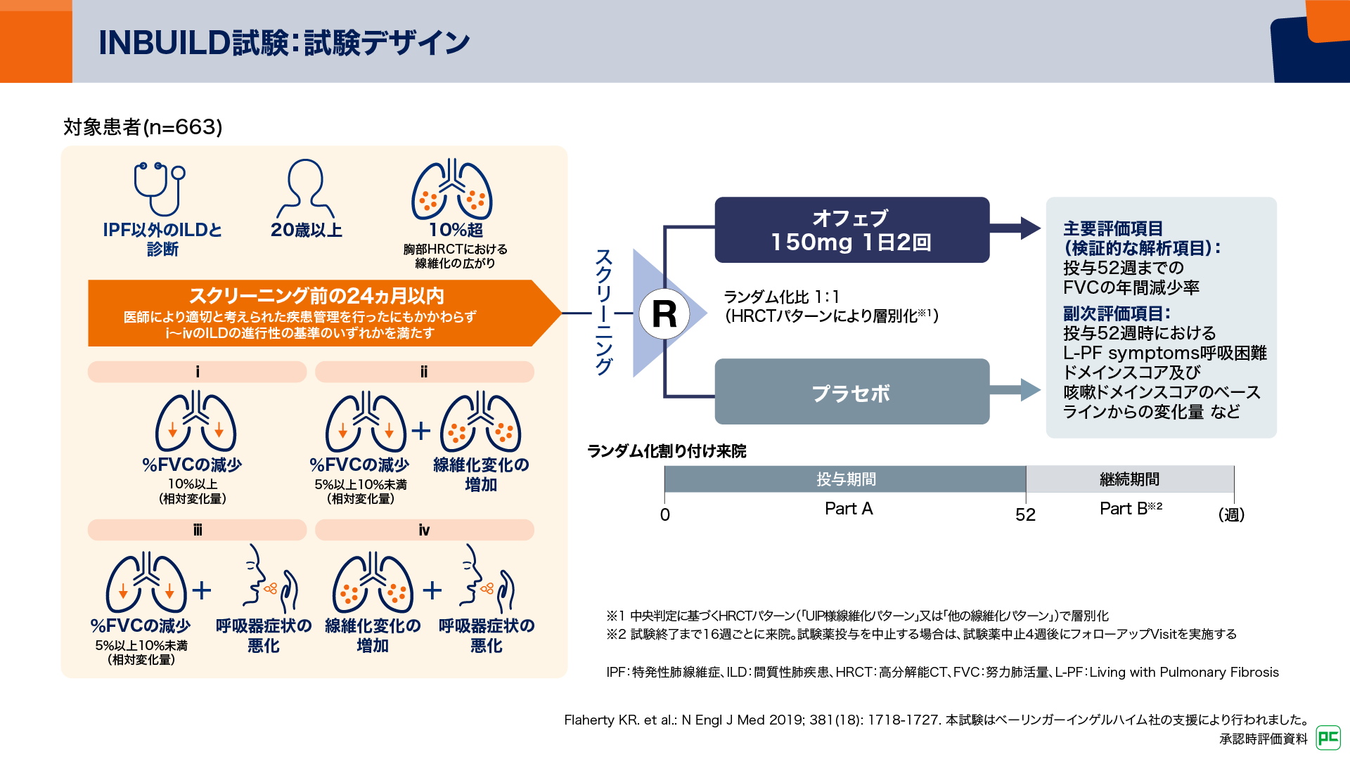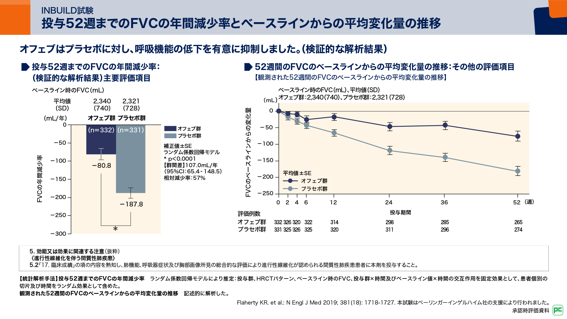 - INBUILD試験の結果から、PF-ILDの早期治療介入や定期的なFVCの評価の重要性が認識されるようになった