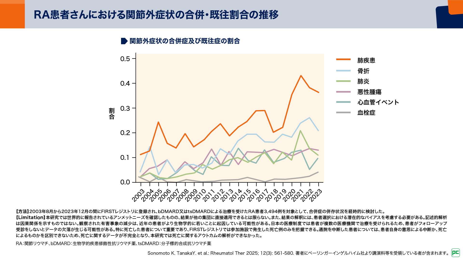 ILDを合併する患者さんの割合は年々増加傾向にありました。RA患者さんを対象とする私共が行ったFIRSTレジストリ研究4)では、RA患者さんにおける肺疾患合併例が、2003年から2023年までの20年間で11.1%から36.2%に増加したことを報告しました(図2)。一部は本疾患の高齢化とも関連している可能性を考えています。