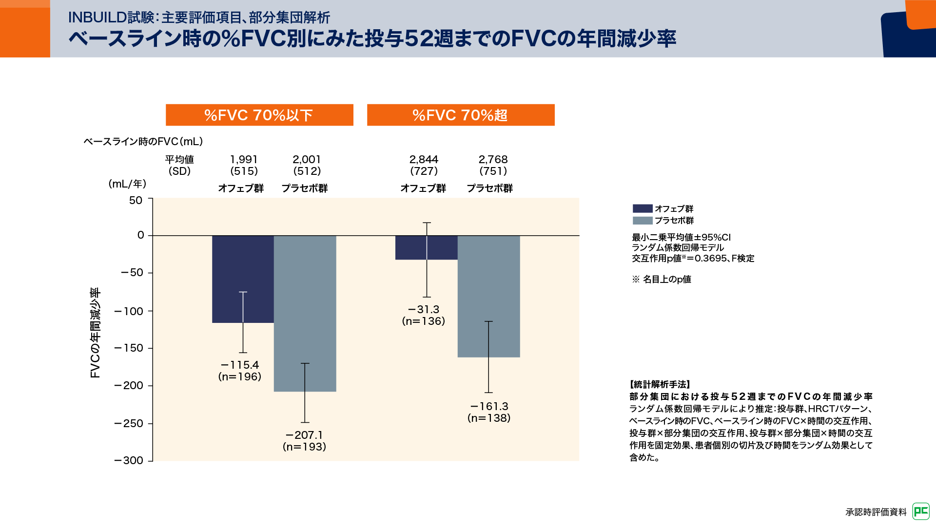 - INBUILD試験ではベースライン時の%FVC別(%FVC70%以下及び70%超)にみた投与52週時までのFVCの年間減少率が検討された