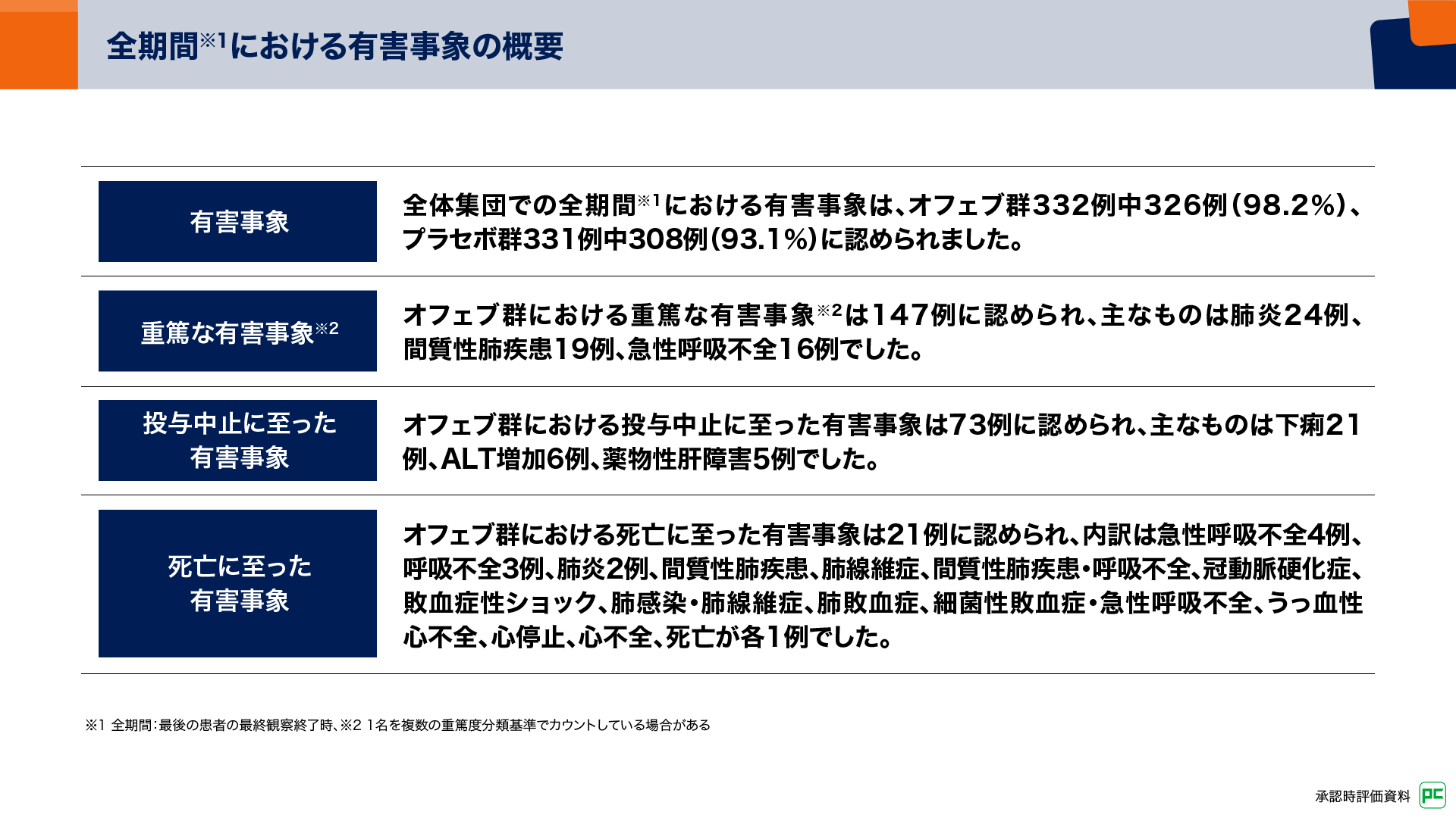 本試験において、有害事象はオフェブ群332例中326例(98.2%)、プラセボ群331例中308例(93.1%)に認められました(図7)。オフェブ群における重篤な有害事象は147例に認められ、主なものは肺炎24例、間質性肺疾患19例、急性呼吸不全16例でした。投与中止に至った有害事象は73例に認められ、主なものは下痢21例、ALT増加6例、薬物性肝障害5例でした。死亡に至った有害事象は21例に認められ、内訳は急性呼吸不全4例、呼吸不全3例、肺炎2例、間質性肺疾患、肺線維症、間質性肺疾患・呼吸不全、冠動脈硬化症、敗血症性ショック、肺感染・肺線維症、肺敗血症、細菌性敗血症・急性呼吸不全、うっ血性心不全、心停止、心不全、死亡が各1例でした。