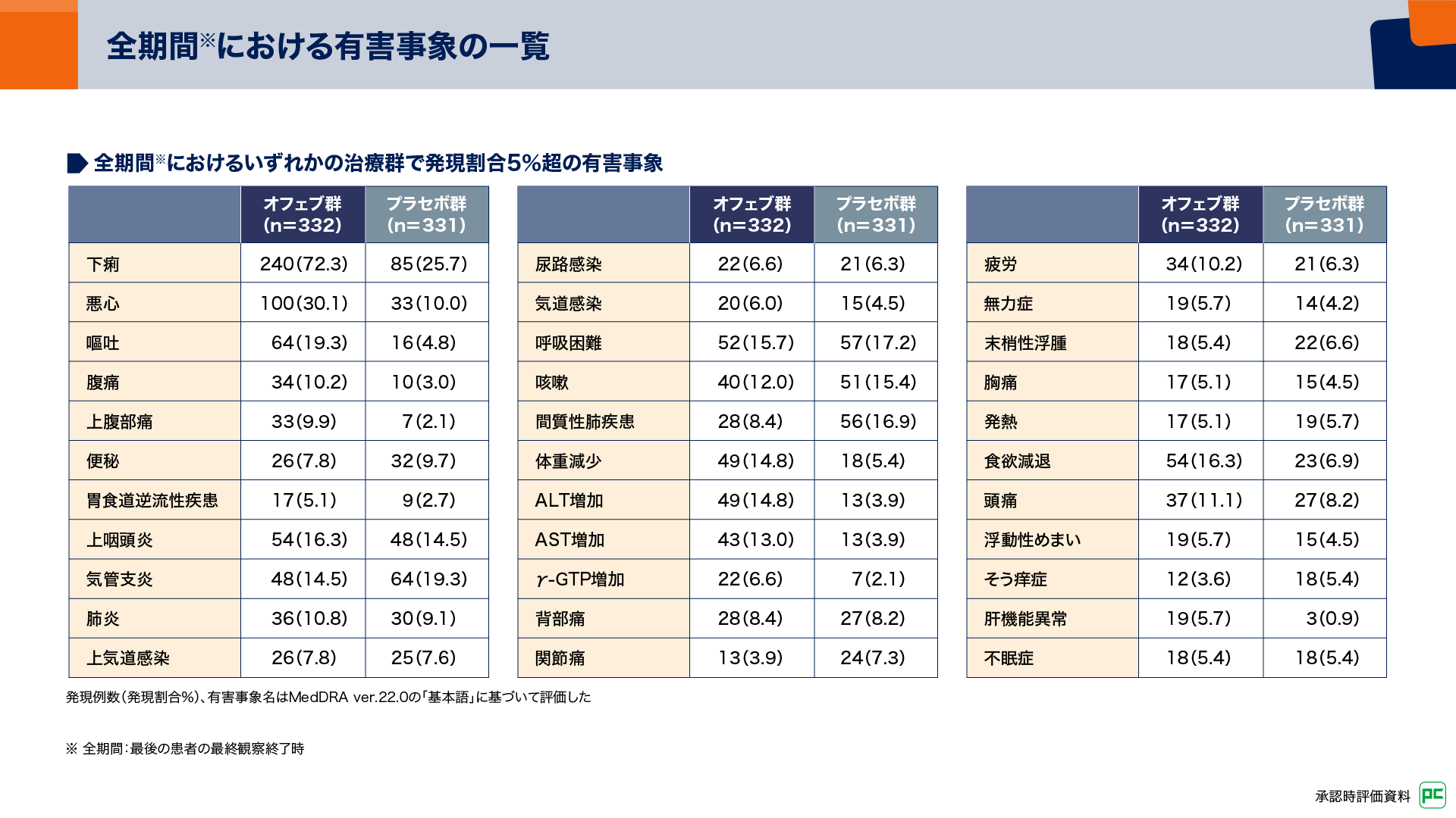 オフェブ群における主な有害事象は、下痢72.3%、悪心30.1%、嘔吐19.3%などでした(図8)6)。