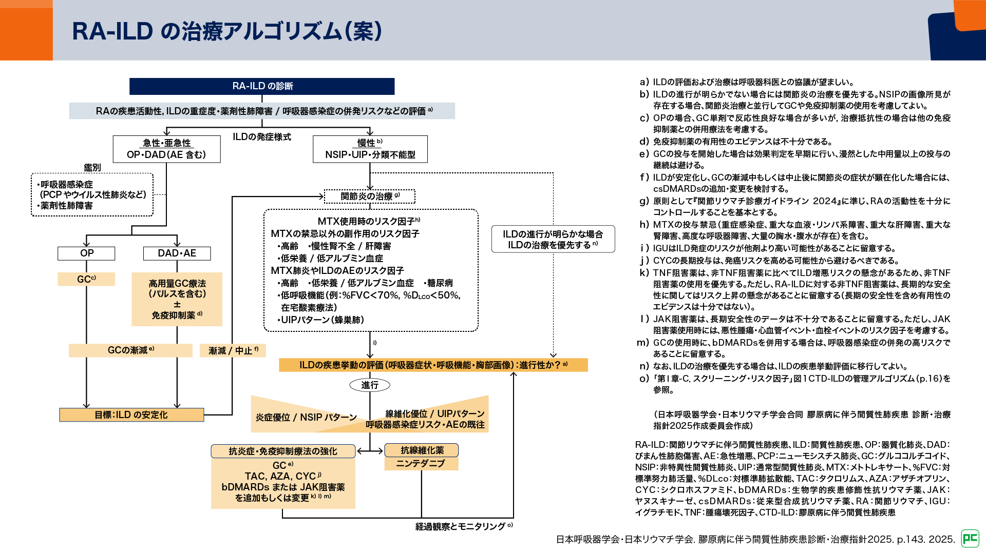 - ILDの存在を念頭におきつつ、いち早くILDを診断し、治療介入を必要とするPF-ILDを見極めることが重要