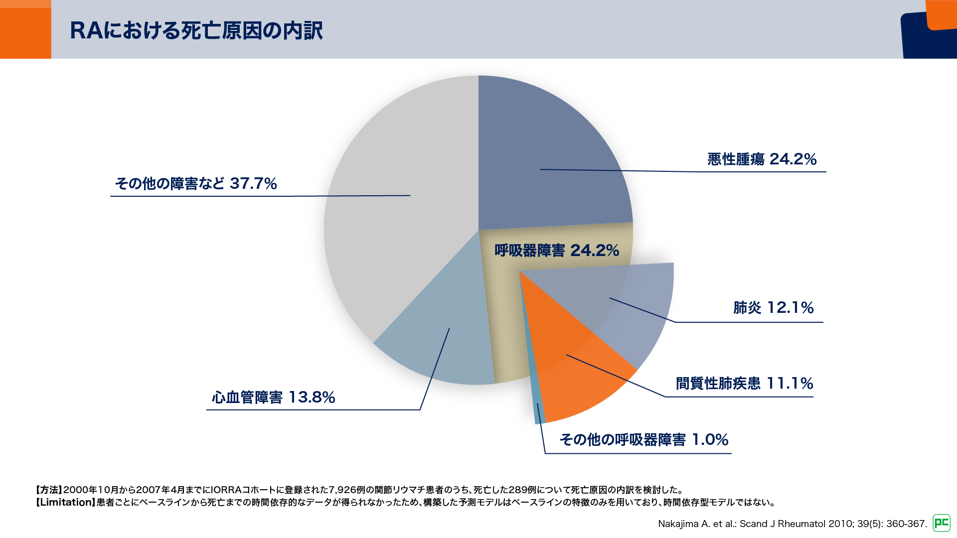 RA自体は致死的な疾患ではありませんが、ILDを合併し肺の線維化が進行すると、肺での酸素交換ができずに呼吸機能が低下し予後不良となります。RA患者では死因の11.1%をILDが占めていると報告されています(図10)7,8)。わが国におけるRA患者数は約83万人と推定されている9)ことから試算すると、約9万人もの方々がILDによって命を落としていることが示唆されます。このように、PF-ILDは患者さんの予後に直接関連する重要な因子であり7)、適切な診療を行うことが重要です。