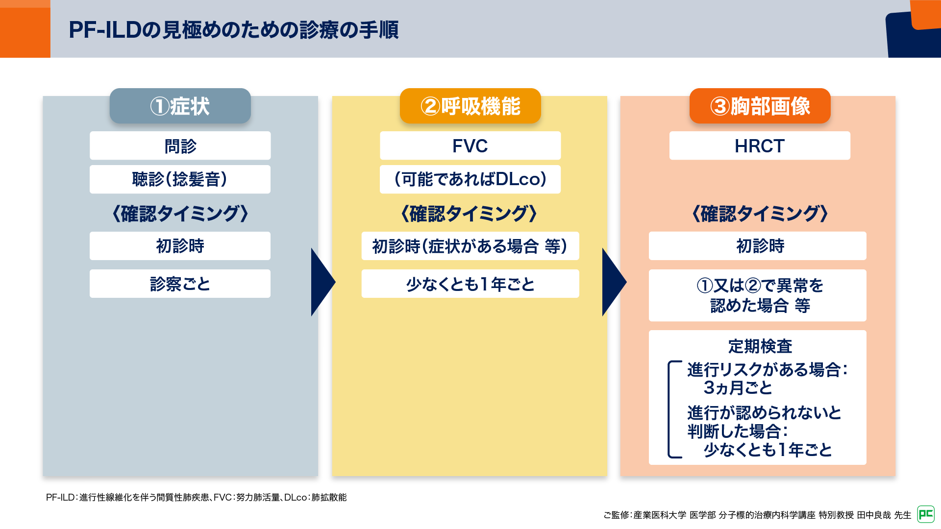 - ①呼吸器症状(問診・聴診)、②呼吸器機能、③胸部HRCTを評価する