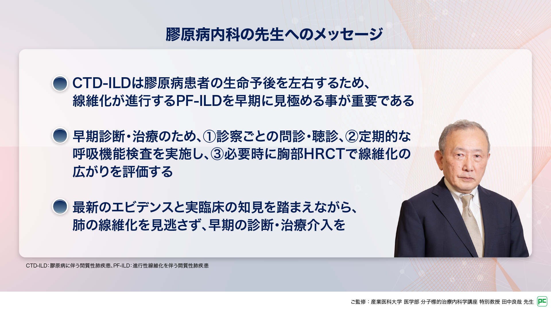膠原病患者さんにおいては、生命予後に関わるPF-ILDを正しく理解・診断し、できるだけ早期に適切な治療へとつなげることが、長期予後を左右する時代になっています。引き続き、最新のエビデンスと実臨床の知見を踏まえながら、肺の線維化を見逃さず、早期介入に努めていただければと思います。