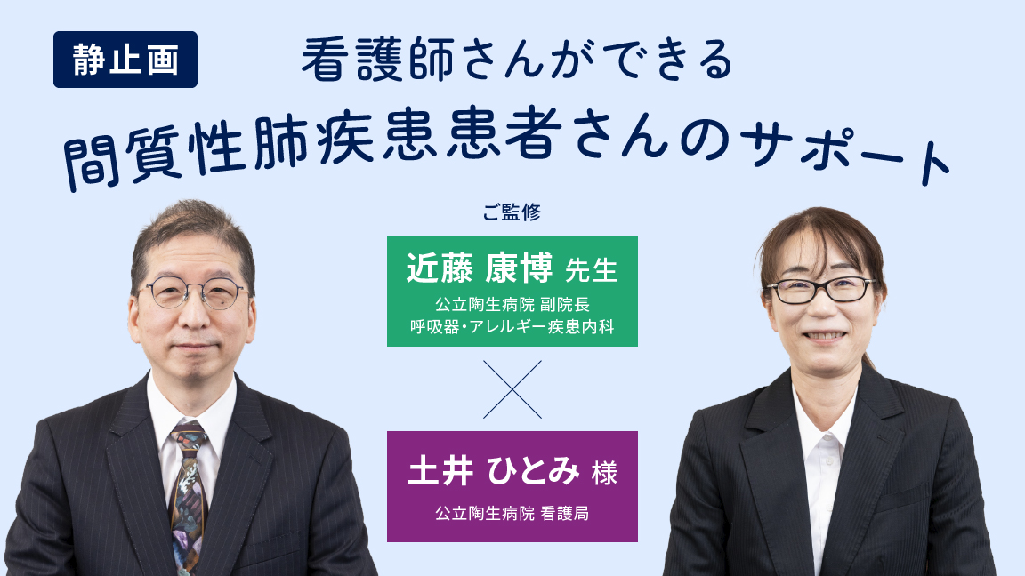 本コンテンツでは、看護師さんができる間質性肺疾患患者さんへのサポートについて、公立陶生病院 副院長 呼吸器・アレルギー疾患内科 近藤 康博先生と、公立陶生病院 看護局 土井 ひとみ様にうかがいます。