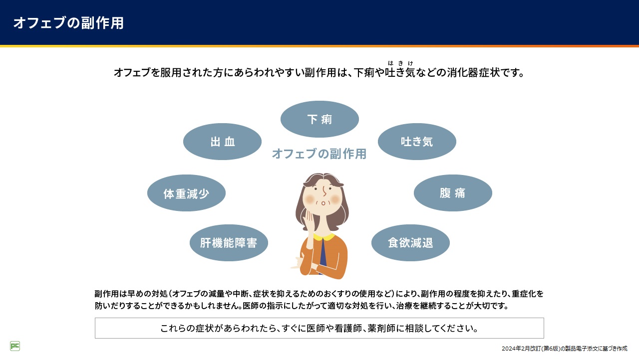 まずは、オフェブによる治療中の患者さんがこのような副作用に困っていないか、看護師の方には聞き取りをしてほしいと思っています。患者さんは副作用が出ていたとしても、「下痢はどうですか?」といったように具体的に聞かないと、言わない場合があります。医師も具体的に聞くことを心がけてはいるものの、患者さんは医師には伝えづらいと思っていたり、伝えるつもりでいても医師の前では忘れてしまったりといったことがあると思います。看護師の方から聞き取ってもらうと、患者さんも緊張せずに副作用について話すことができるのではないかと思います。