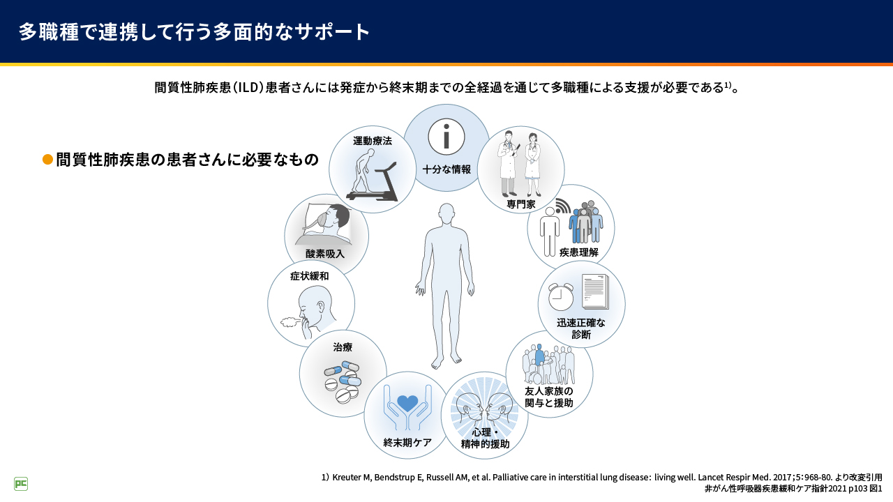 間質性肺疾患に対する治療を早期に開始し、継続するためには、看護師さんによる患者さんへのサポートが重要です。