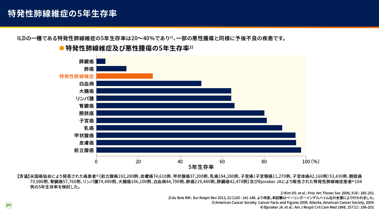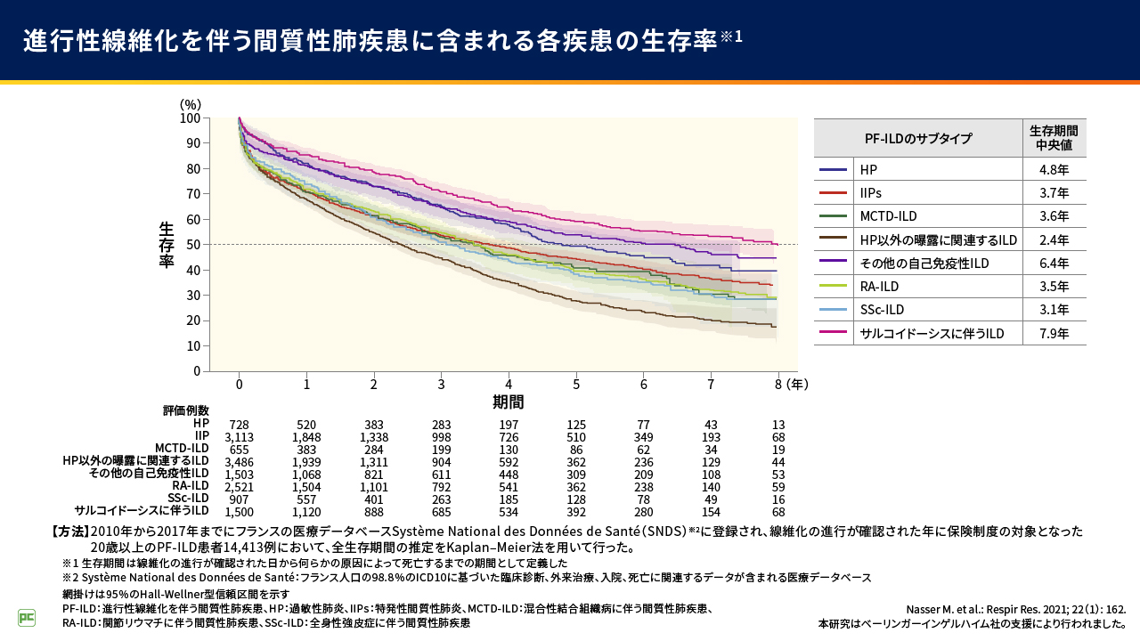 診断時などに医師から患者さんに間質性肺疾患の説明はしていますが、一部、医師からの説明だけでは理解しきれないという患者さんや、理解はしても疾患を受け止め切れない患者さんもいらっしゃいます。このような患者さんから、間質性肺疾患に関する質問や相談を看護師の方が受けた場合には、「患者さんがどのように疾患を受け止めているか」ということをまず聞き取ってほしいと思います。このほかにも、インターネットで間質性肺疾患のひとつである特発性肺線維症の予後(図2)を見て、不安を持たれている患者さんもいらっしゃいます。不安を持たれている患者さんに対しては、特発性肺線維症と同じように進行性の肺線維化がみられる間質性肺疾患であっても、疾患の種類などの個人差によって予後に違いがみられること(図3)などをお伝えすると、不安を和らげることができるかと思います。一方で、予後に関わる疾患であるにもかかわらず、楽観視されている患者さんもいらっしゃいます。そのような方に対しては、向き合う必要がある疾患であることを看護師の方からお伝えするとよいと思います。