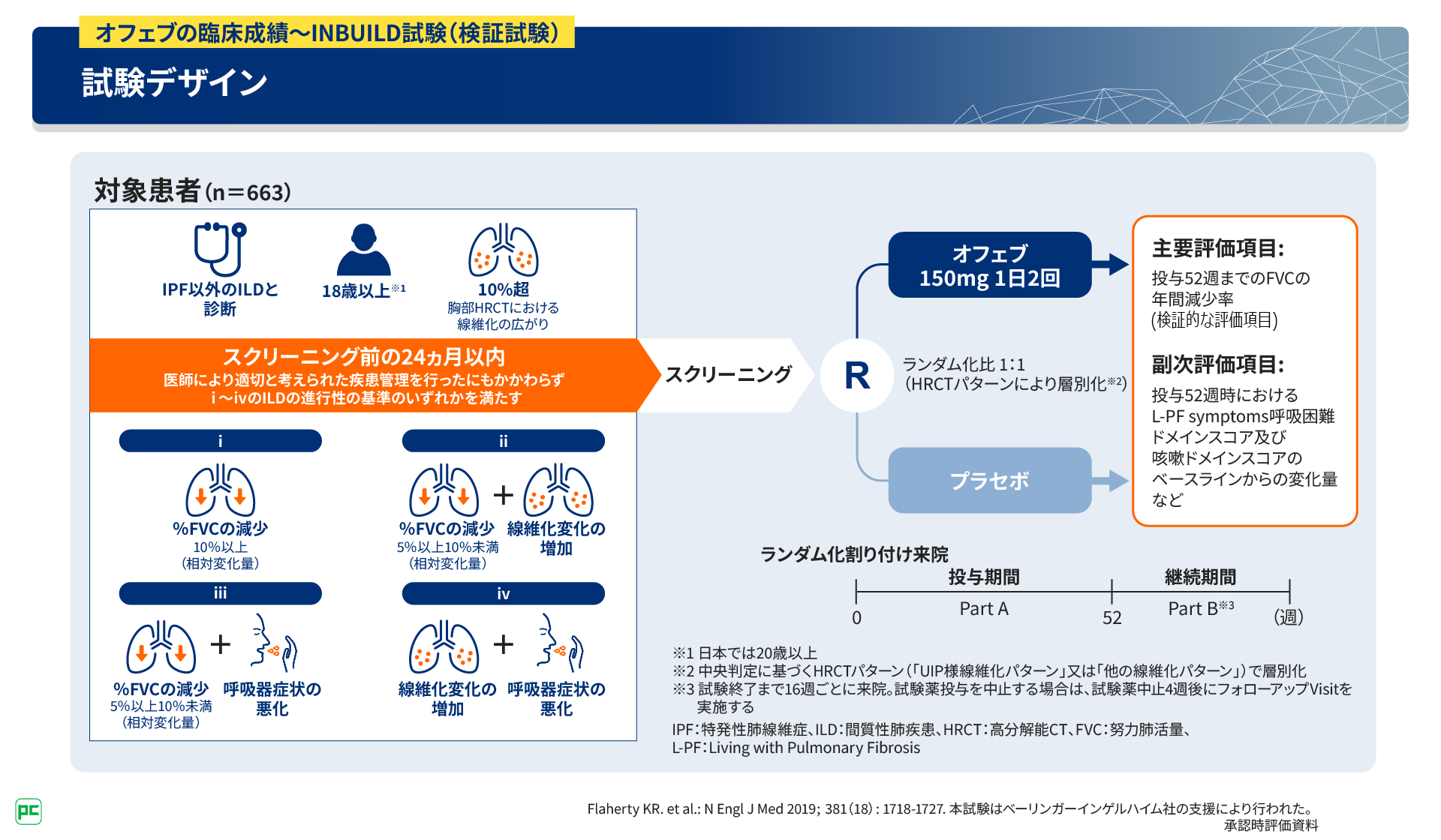 ここから、PF-ILD患者さんを対象にオフェブの有効性と安全性を検討した国際共同第Ⅲ相試験INBUILD試験をみていきましょう(図5)。