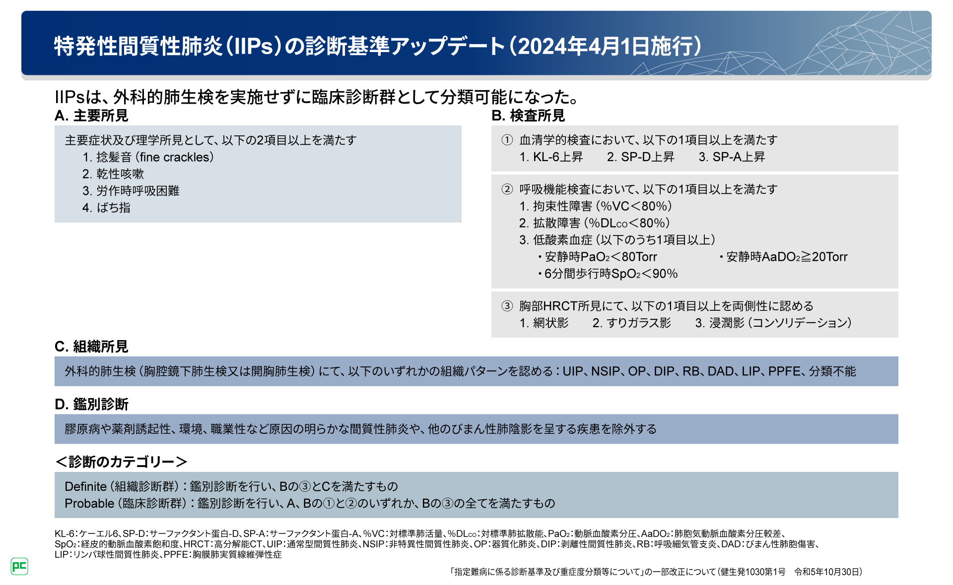 過去の指定難病としての特発性間質性肺炎(IIPs)の診断基準では、外科的肺生検が医療費助成の申請における基準のひとつとなっていました。