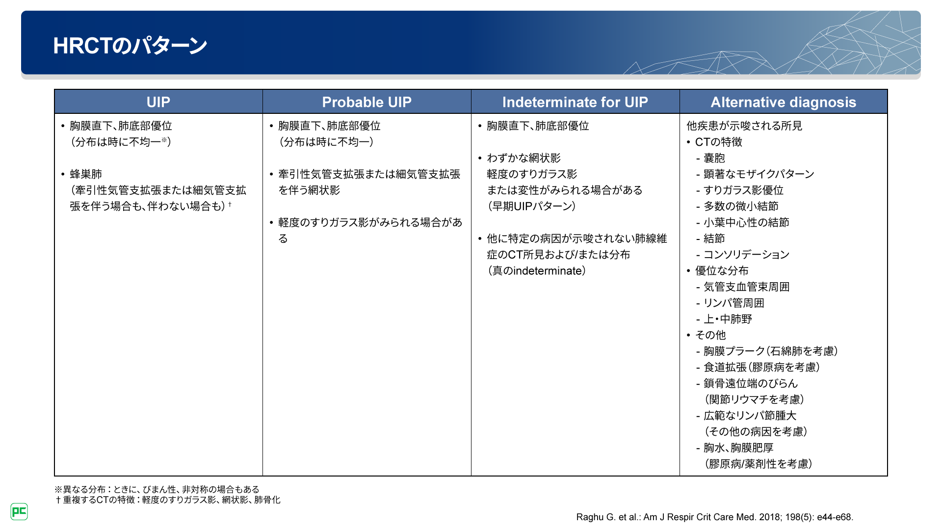 胸部HRCTパターンは「UIP」「Probable UIP」「Indeterminate for UIP」「Alternative diagnosis」の4つに分類されます(図4)。