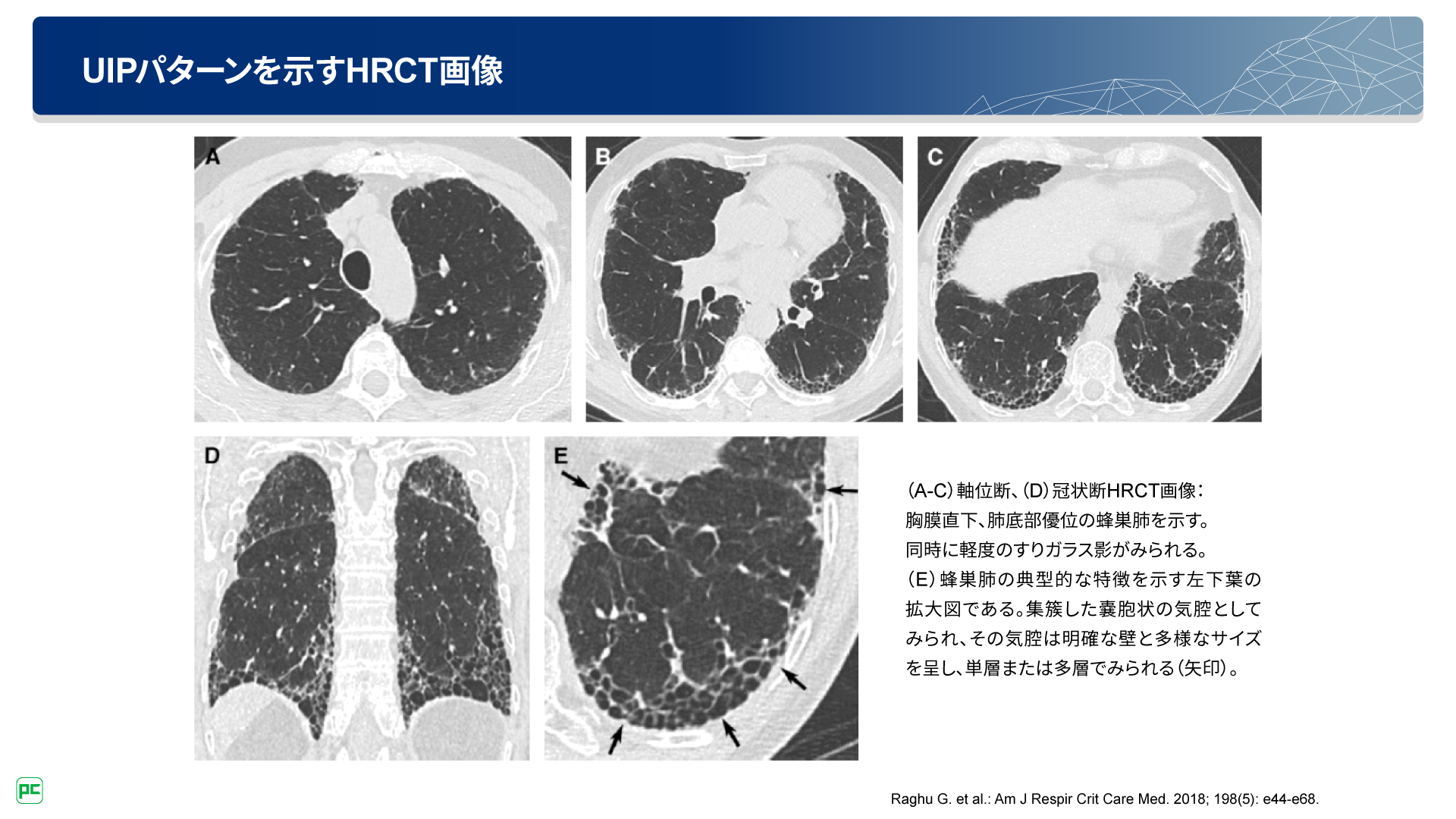 胸部HRCT検査における蜂巣肺の存在は、特発性肺線維症(IPF)の診断において重要な所見です。しかし、一部のIPF患者さんは蜂巣肺のないProbable UIPパターンを示します。予後の延長や急性増悪の抑制、呼吸機能低下の抑制のために、UIPパターンのIPF患者さんだけでなく、Probable UIPパターンのIPF患者さんに対しても早期治療介入が必要です。