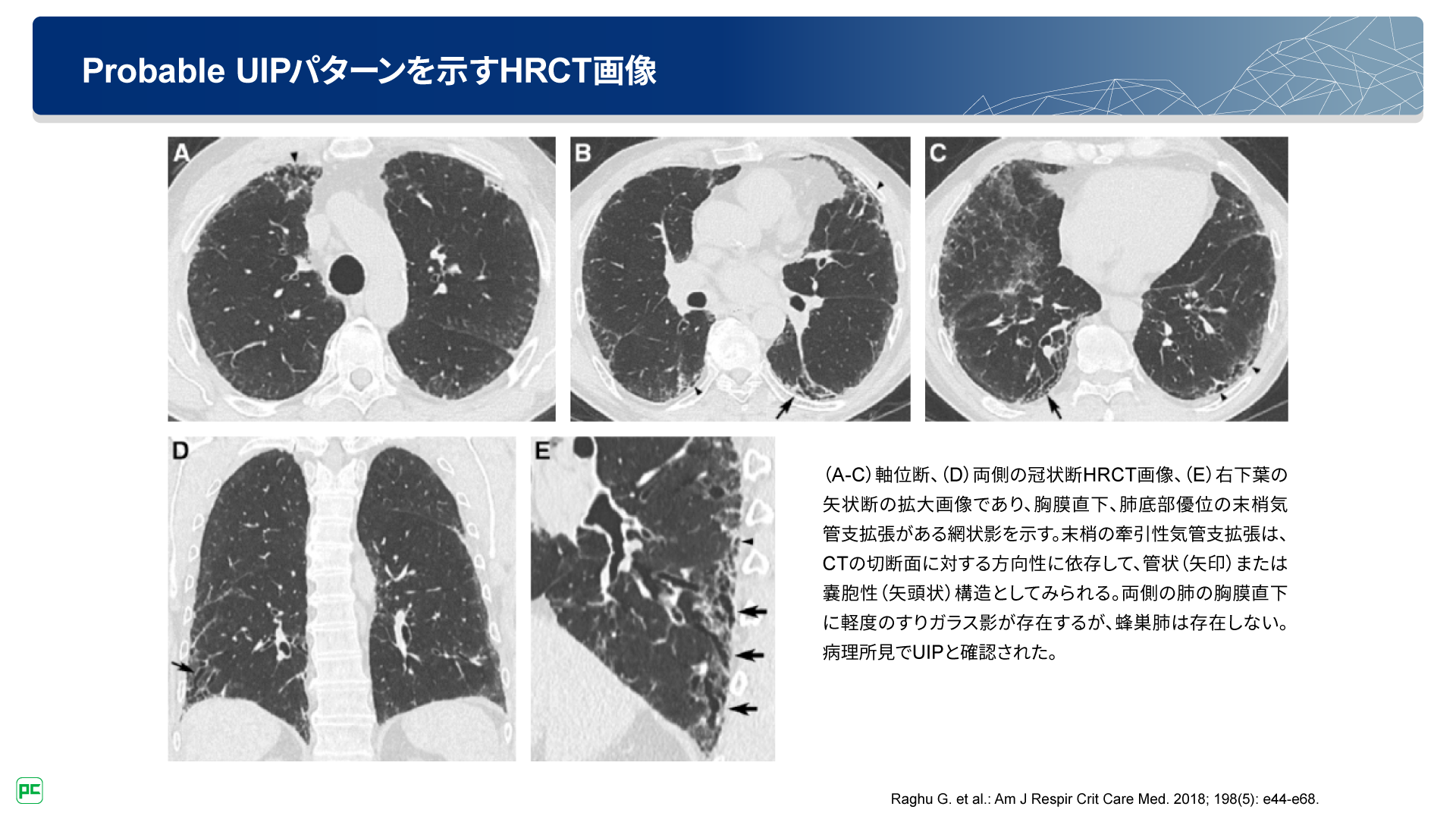 先ほど紹介した、指定難病における診断基準に示されているIPF「疑い」は、Probable UIPパターンに相当します。