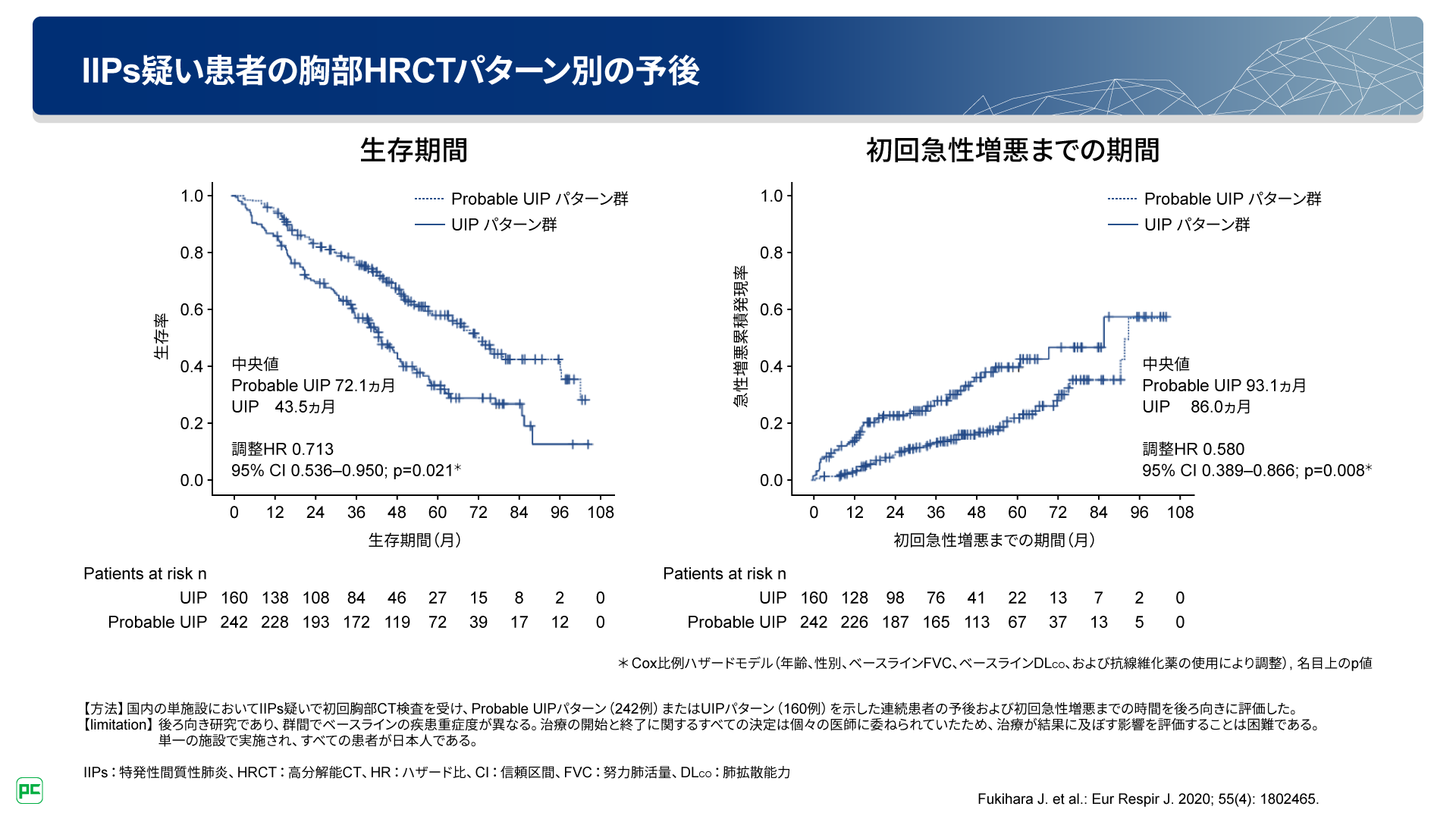 初回胸部HRCT検査でProbable UIPパターンまたはUIPパターンを示したIIPs疑い患者さんの予後や初回急性増悪までの期間を検討した国内の研究では、Probable UIPパターン群の生存期間中央値は72.1ヵ月、UIPパターン群の生存期間中央値は43.5ヵ月でした(図7左)。また、初回急性増悪までの期間は、Probable UIPパターン群で93.1ヵ月、UIPパターン群で86.0ヵ月でした(図7右)。生存期間も、初回増悪までの期間も、UIPパターン群で有意に短いという結果です。