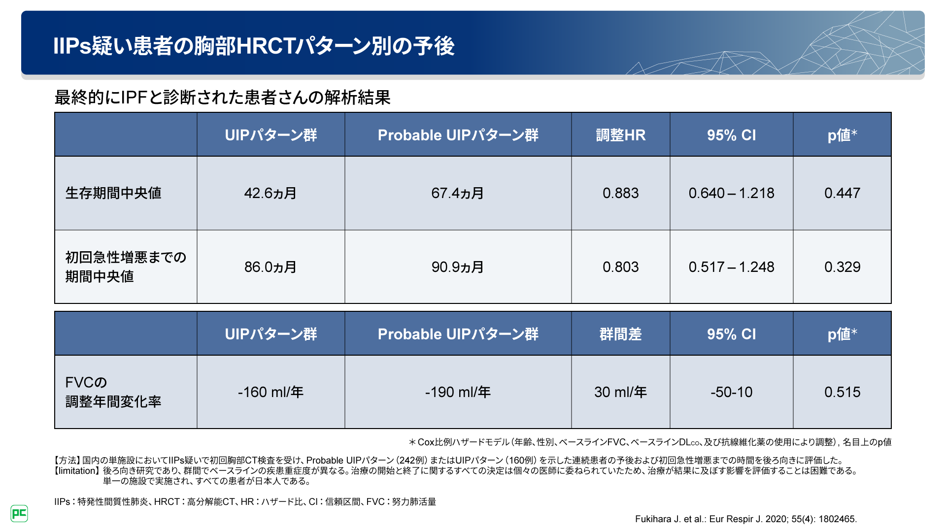 なお、最終的にIPFと診断された患者さんのみについて解析すると、生存期間、初回急性増悪までの期間のいずれもUIPパターン群とProbable UIPパターン群で有意差は認められませんでした。また、FVCの調整年間変化率についても有意差は認められませんでした(図8)。