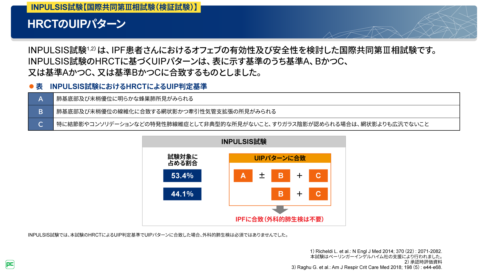 本試験における胸部HRCTパターンの判定は、「A. 肺基底部及び末梢優位に明らかな蜂巣肺所見がみられる」「B. 肺基底部及び末梢優位の線維化に合致する網状影かつ牽引性気管支拡張の所見がみられる」「C. 特に結節影やコンソリデーションなどの特発性肺線維症として非典型的な所見がないこと、すりガラス陰影が認められる場合は、網状影よりも広汎でないこと」の3つの基準に基づいて行われました。3つ全ての基準を満たす場合のほか、蜂巣肺所見がみられて特発性肺線維症として非典型的な所見がない場合(AかつC)、また、網状影かつ牽引性気管支拡張の所見がみられて特発性肺線維症として非典型的な所見がない場合(BかつC)がUIPパターンと判定されました。