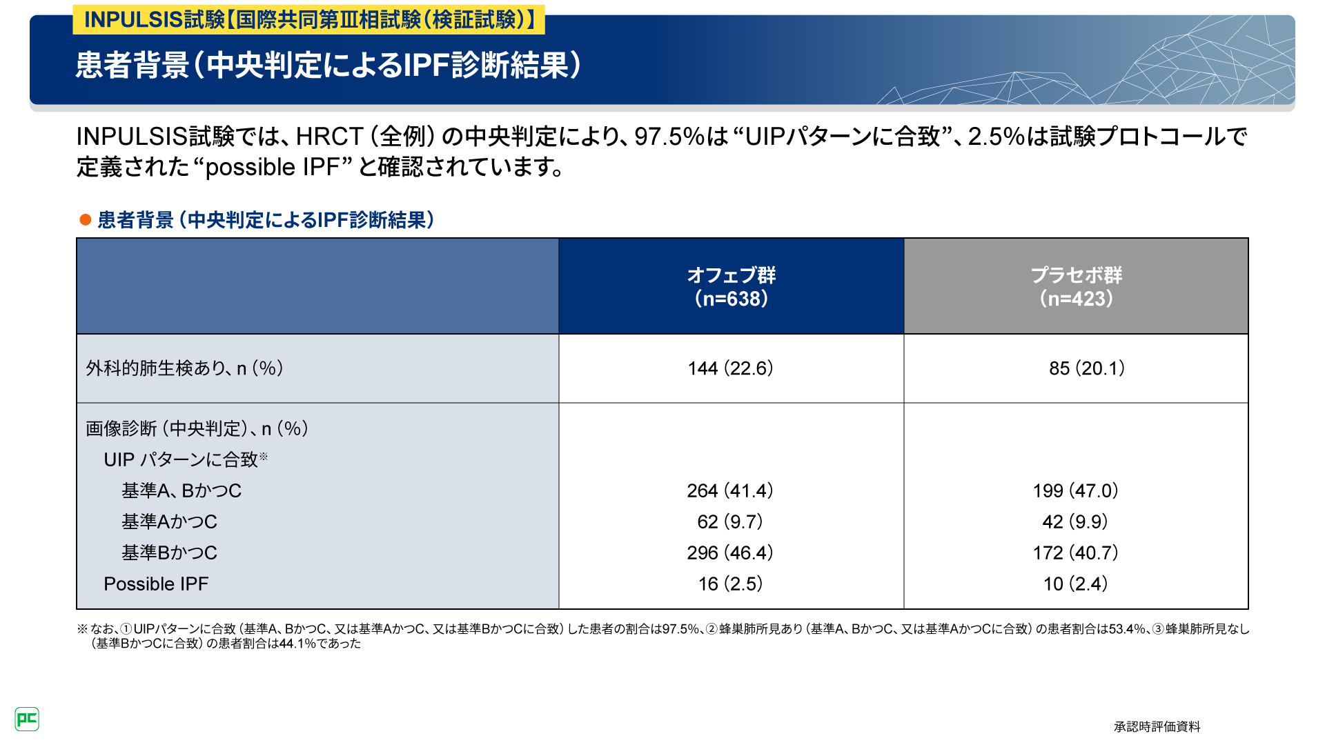 UIPパターンと判定された患者さんには、「A. 肺基底部及び末梢優位に明らかな蜂巣肺所見がみられる」に合致しないIPF患者さんが44.1%(オフェブ群 46.4%、プラセボ群40.7%)含まれていました(図12、13)。