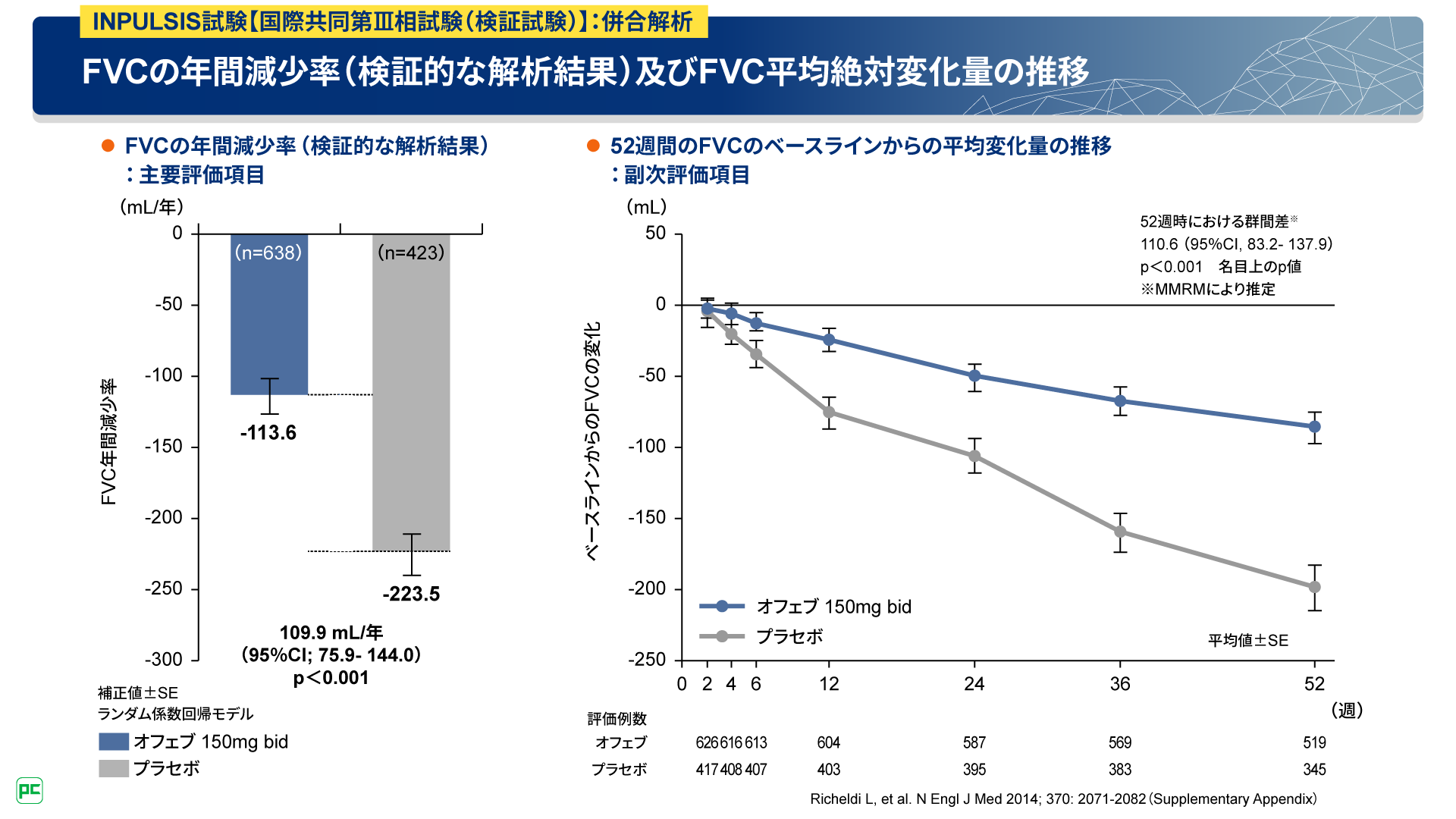併合解析の結果、主要評価項目である52週におけるFVCの年間減少率は、オフェブ群-113.6mL/年、プラセボ群-223.5mL/年であり、オフェブ群はプラセボ群に対して呼吸機能の低下を有意に抑制することが検証されました(群間差:109.9 mL/年、95%信頼区間:75.9- 144.0、p<0.001、ランダム係数回帰モデル)(図14左)。