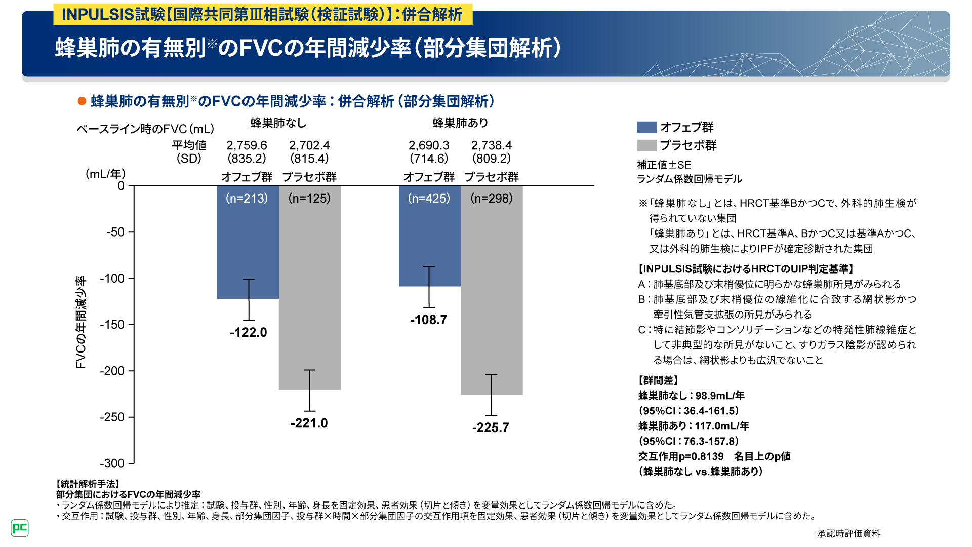 この結果を踏まえると、オフェブによる呼吸機能低下の抑制効果は、蜂巣肺の有無によらず期待できると言えます。