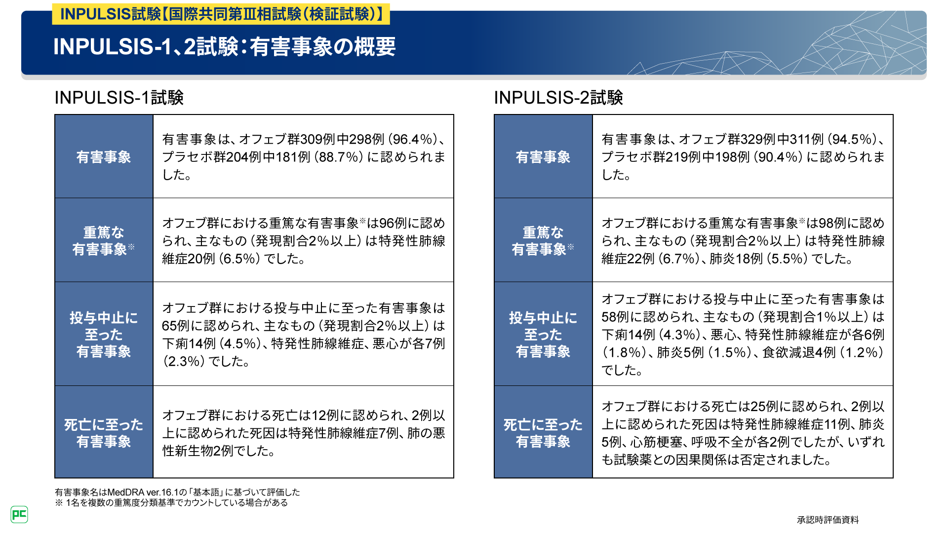 本試験を構成するINPULSIS-1試験及びINPULSIS-2試験の有害事象の概要を図16にお示しします。