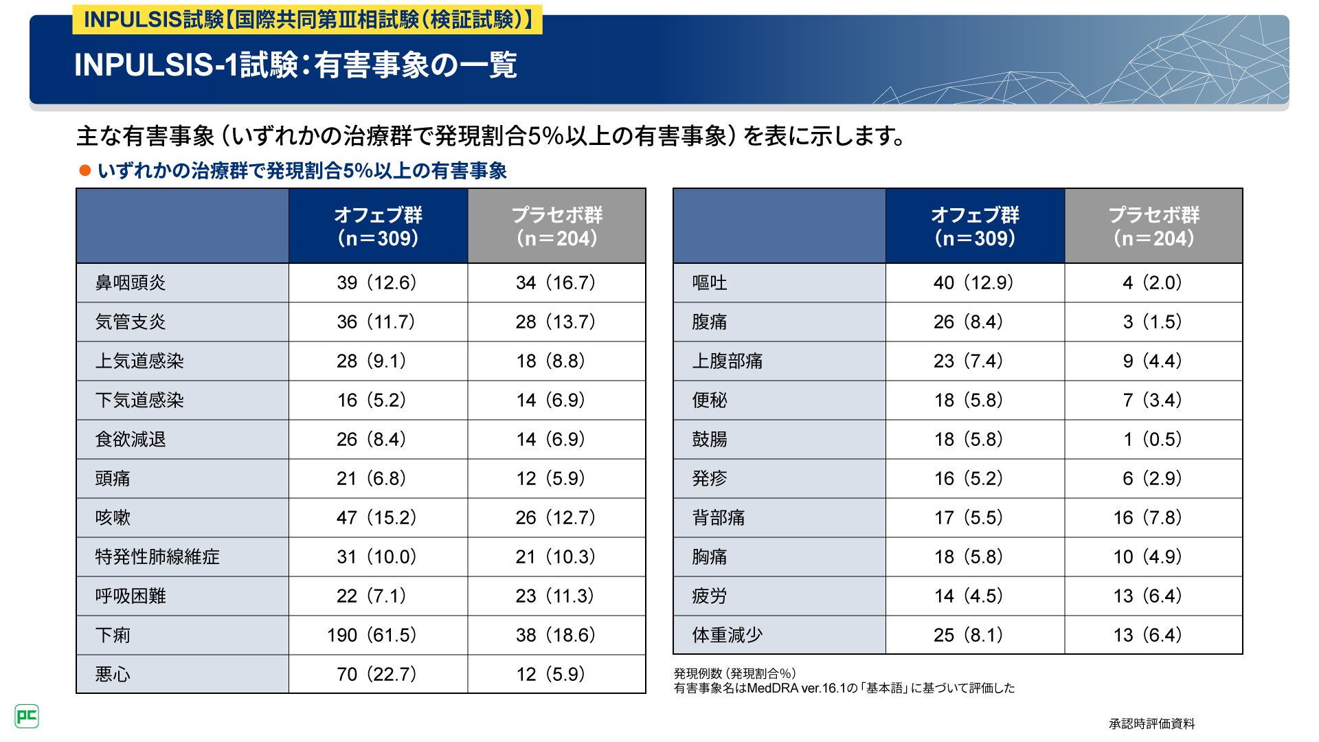 INPULSIS-1試験における主な有害事象は、オフェブ群で発現頻度が高い順に、下痢190例(61.5%)、悪心70例(22.7%)、咳嗽47例(15.2%)など、プラセボ群で下痢38例(18.6%)、鼻咽頭炎34例(16.7%)、気管支炎28例(13.7%)などでした(図17)。