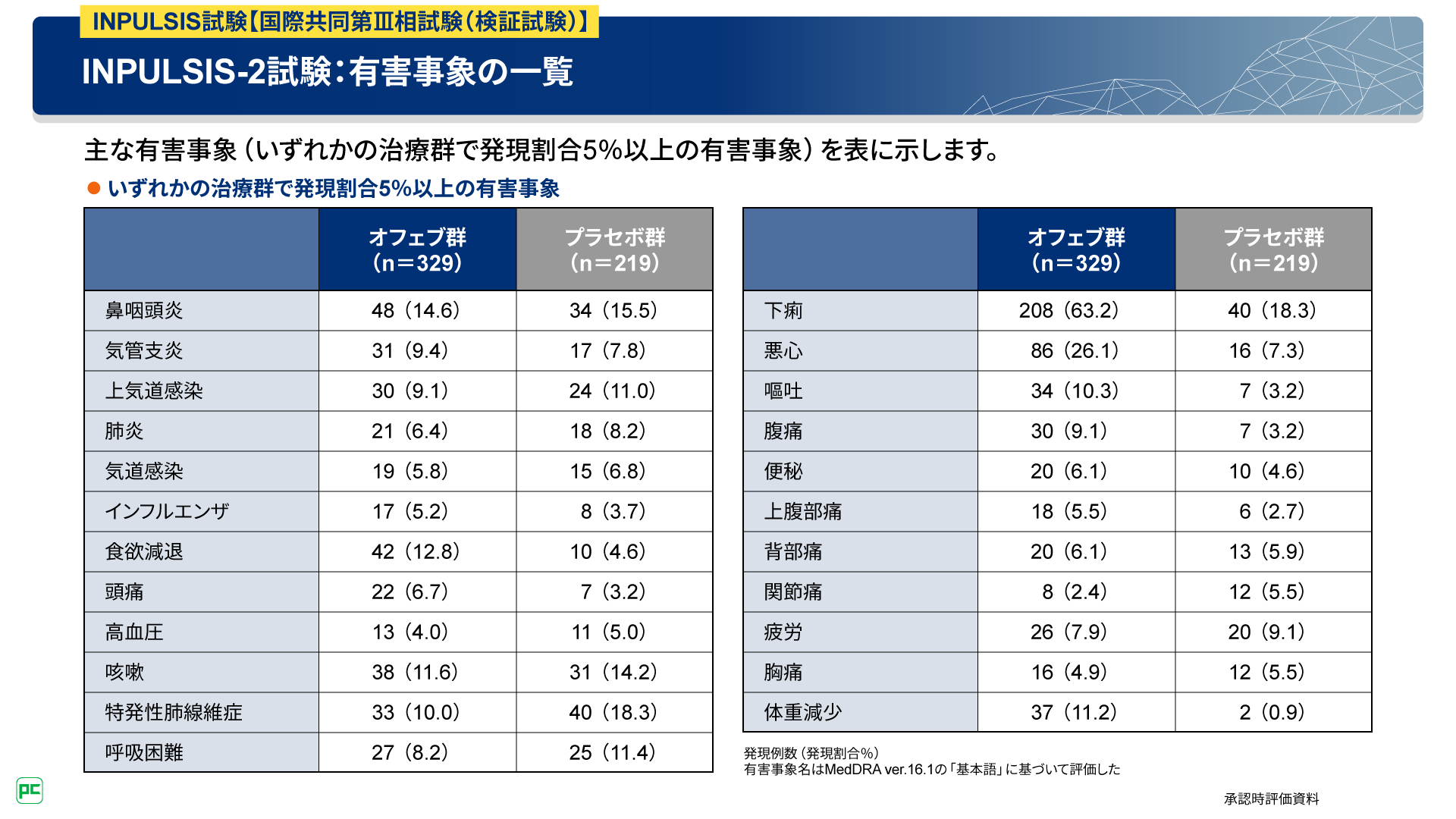 INPULSIS-2試験においては、有害事象は、オフェブ群329例中311例(94.5%)、プラセボ群219例中198例(90.4%)に認められました。