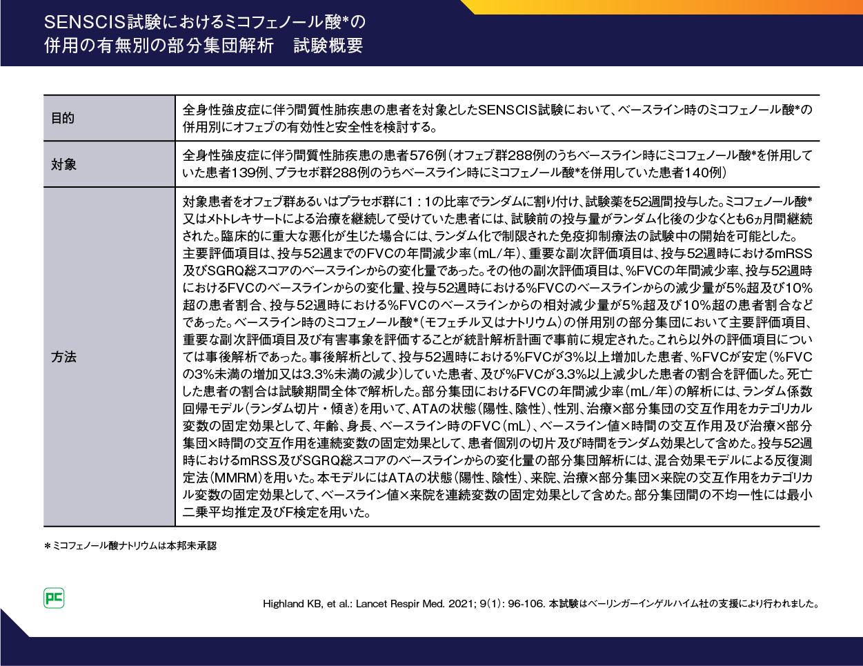 MMFとオフェブの併用については、SENSCIS試験では投与52週までのFVCの年間減少率に関してMMF併用の有無で層別化した部分集団解析が実施されました(図7)18)。