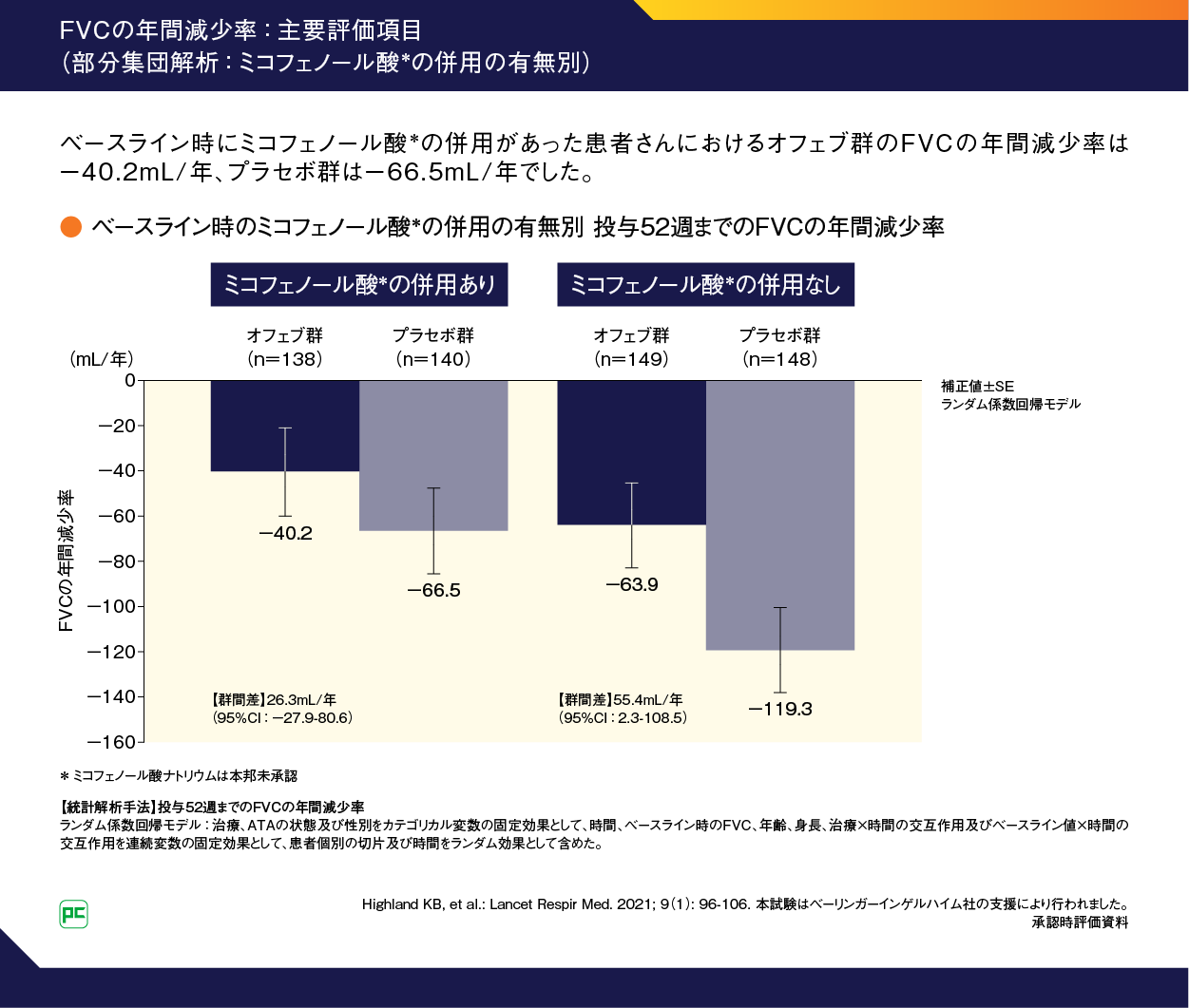 ベースライン時にMMFを併用していた部分集団におけるFVCの年間減少率は、オフェブ群で-40.2mL/年、プラセボ群では-66.5mL/年でした。一方、ベースライン時にMMFを併用していなかった部分集団におけるFVCの年間減少率は、オフェブ群で-63.9mL/年、プラセボ群では-119.3mL/年でした(図8)。
