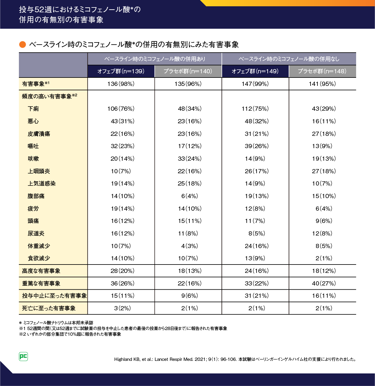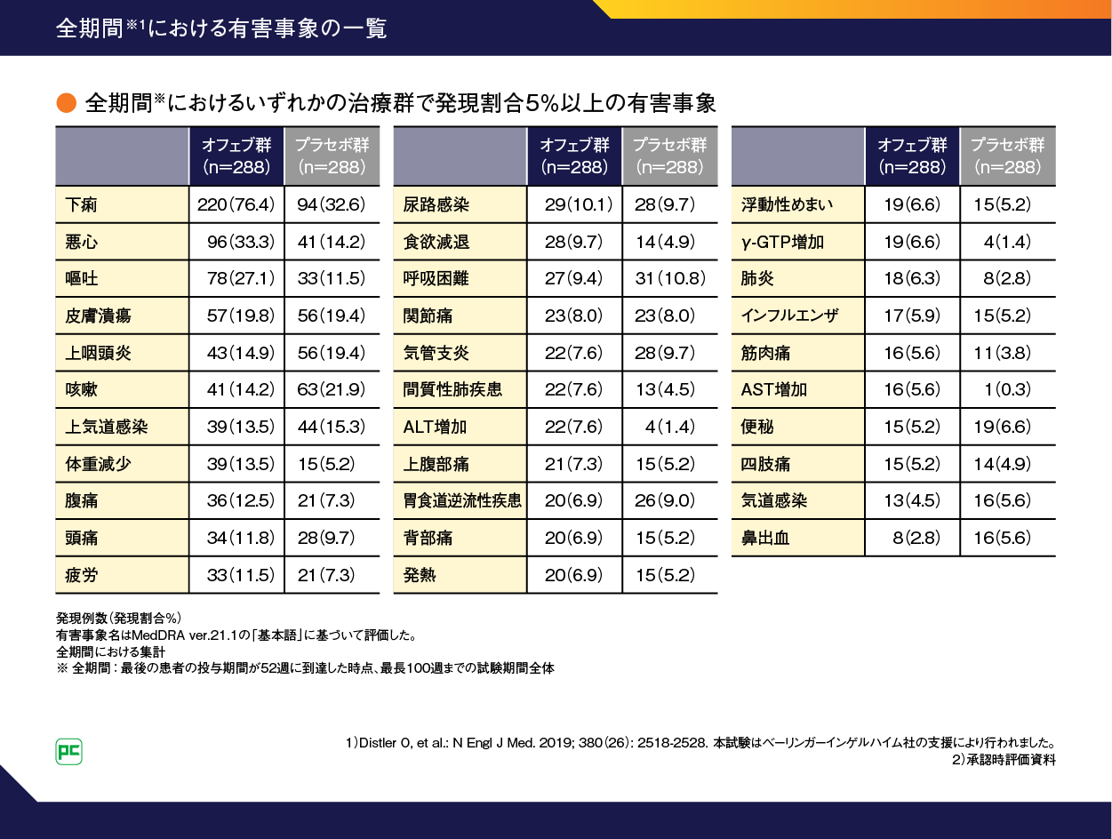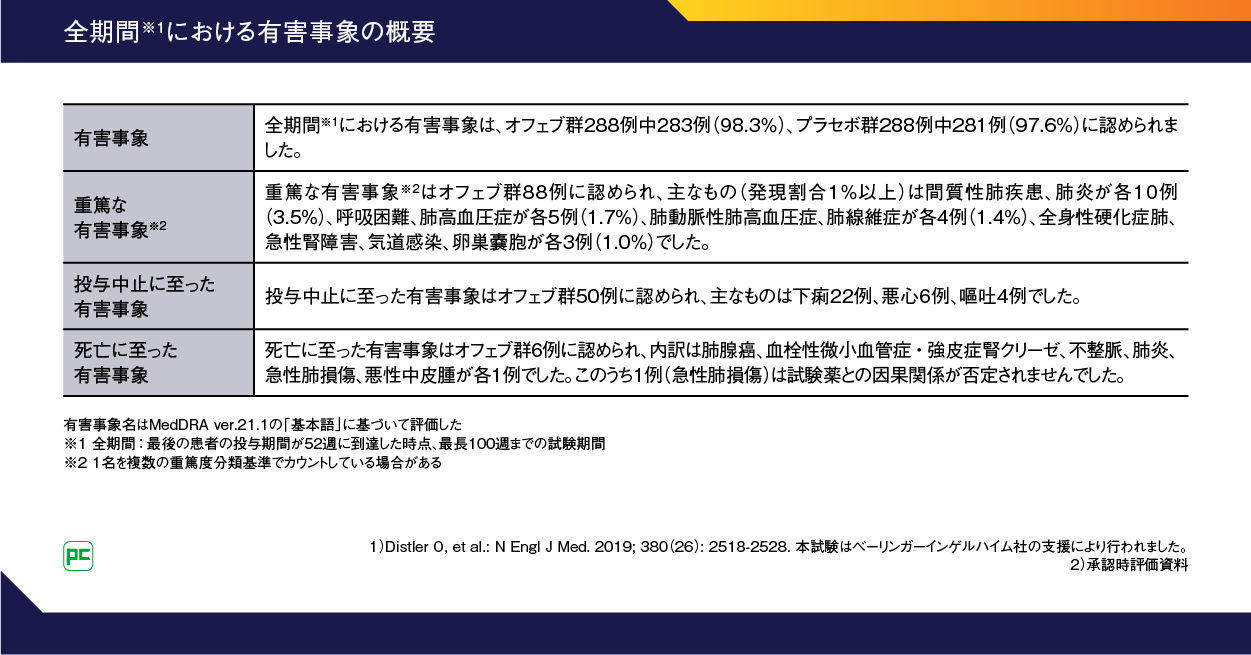 オフェブ群における投与中止に至った有害事象は50例に認められました。主なものは、下痢22例、悪心6例、嘔吐4例でした。重篤な有害事象はオフェブ群88例に認められ、主なもの(発現率1%以上)は間質性肺疾患、肺炎が各10例(3.5%)、呼吸困難、肺高血圧症が各5例(1.7%)、肺動脈性肺高血圧症、肺線維症が各4例(1.4%)、全身性硬化症肺、急性腎障害、気道感染、卵巣嚢胞が各3例(1.0%)でした。死亡に至った有害事象はオフェブ群6例に認められ、内訳は肺腺癌、血栓性微小血管症・強皮症腎クリーゼ、不整脈、肺炎、急性肺損傷、悪性中皮腫が各1例でした。このうち1例(急性肺損傷)は試験薬との因果関係が否定されませんでした。