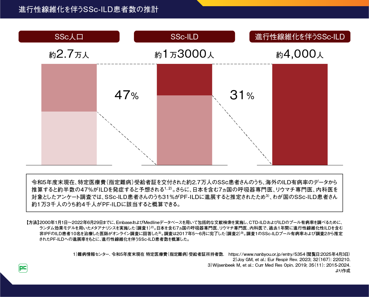 それでは、わが国において、SSc患者さんのうちどのくらいの割合でILDを発症し、また発症したSSc-ILDのうちどのくらいの割合が進行性線維化を伴う間質性肺疾患(PF-ILD)に進展するのでしょうか。
