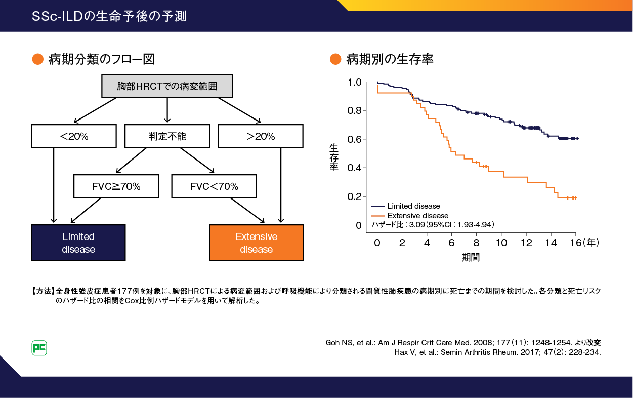 Goh分類では、SSc-ILDと診断された患者に対して、胸部HRCTでの病変範囲が20%<、または病変範囲が判定不能で%FVCが≧70%の症例をLimited diseaseとし、胸部HRCTでの病変範囲が>20%、または病変範囲が判定不能で%FVC が<70%の症例をExtensive diseaseとしています。