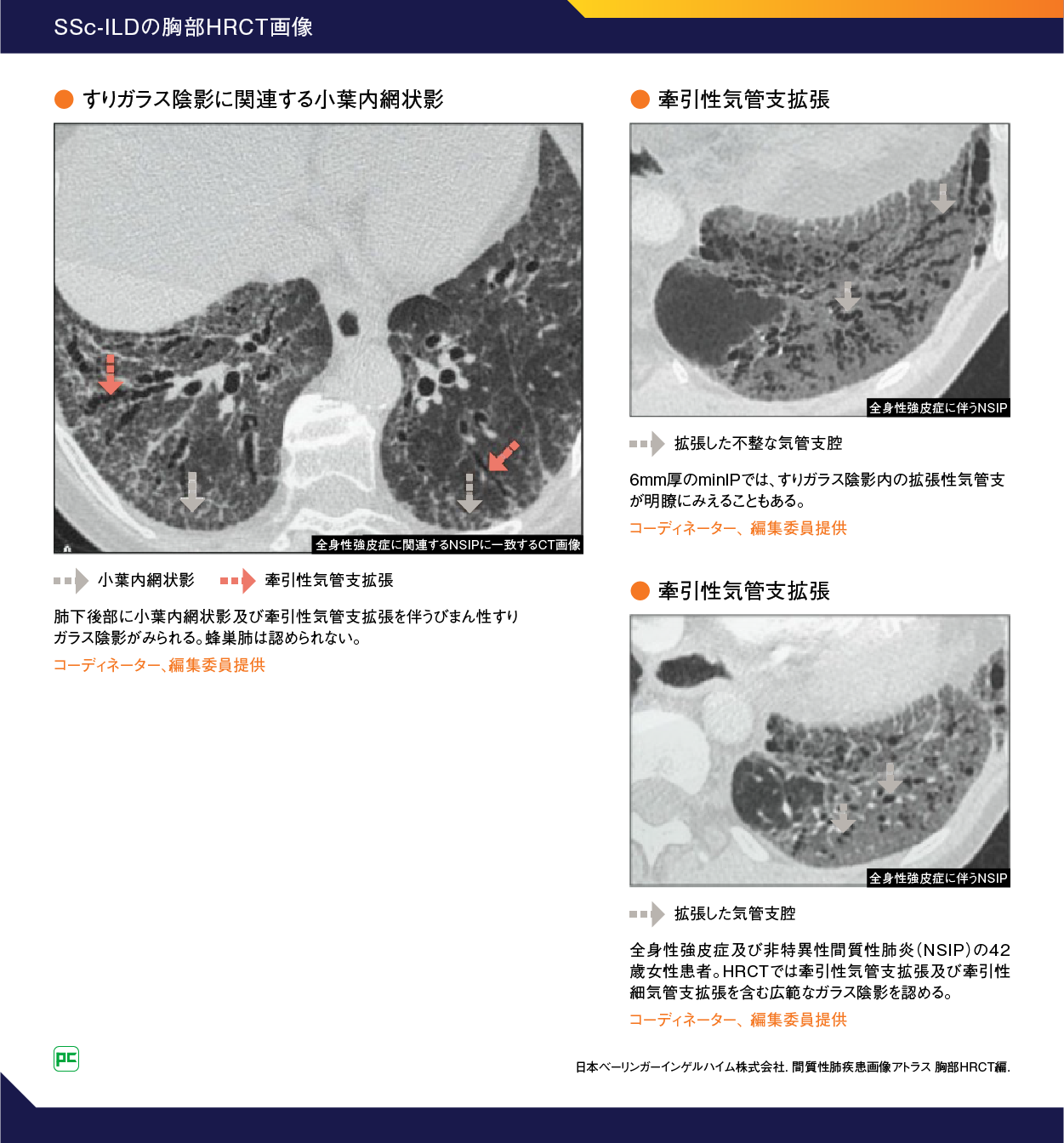 また、SSc-ILD患者でみられるすりガラス影は経過のなかで牽引性気管支拡張へと変化することがあります10)。このように、すりガラス影が牽引性気管支拡張へと進行する理由として、すりガラス影が炎症だけでなく小葉内の線維化を反映していることが要因と推測されています 11)。