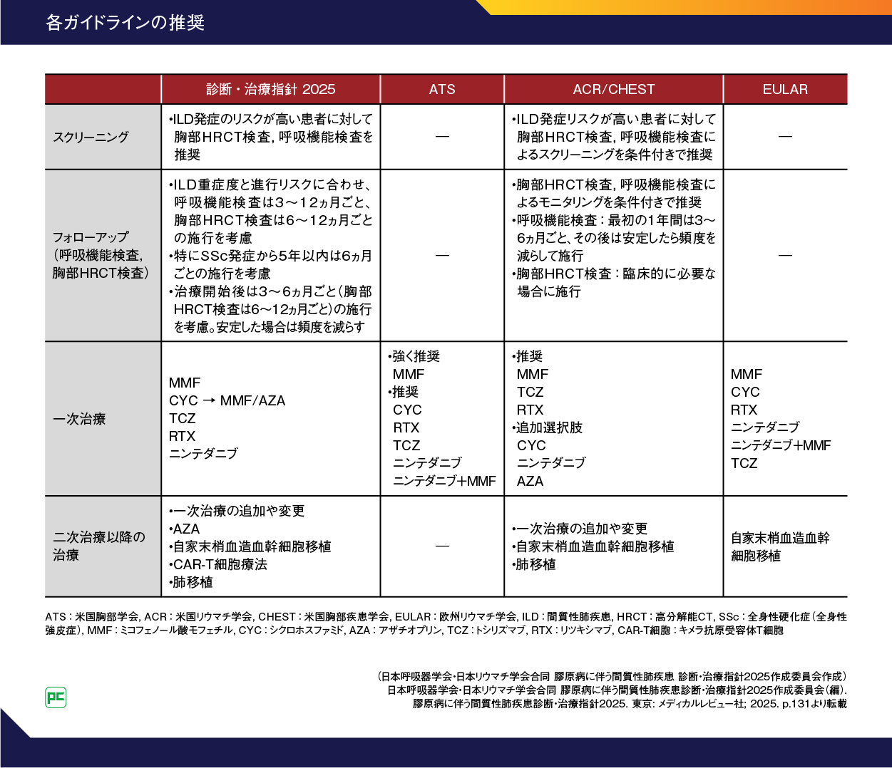 各ガイドラインが推奨するSSc-ILDの治療方針