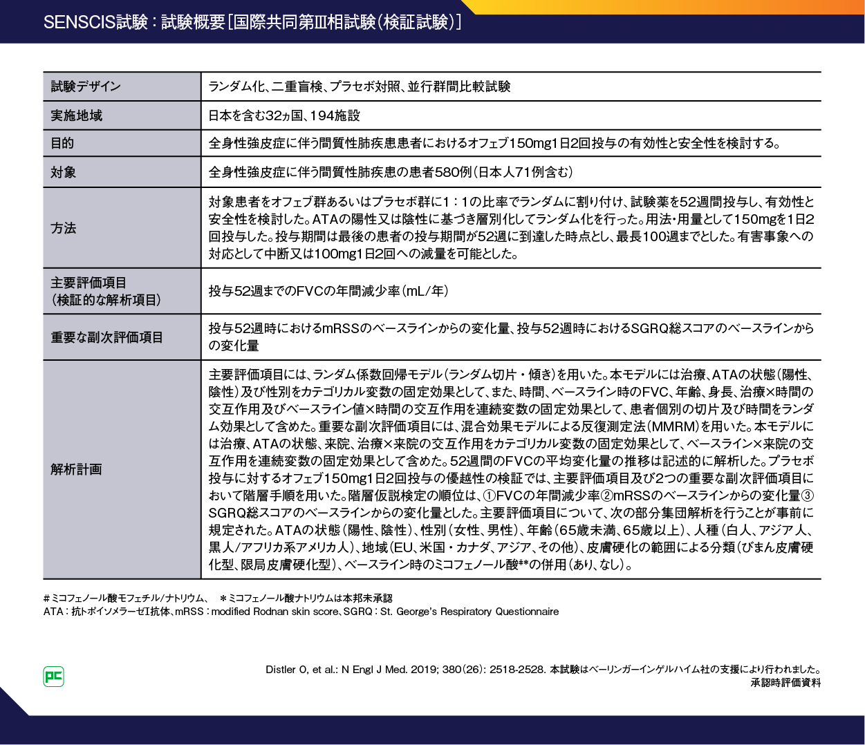 全身性強皮症に伴う間質性肺疾患(SSc-ILD)におけるオフェブの有効性と安全性を検討した国際共同第Ⅲ相試験(SENSCIS試験)の試験概要です(図5)。