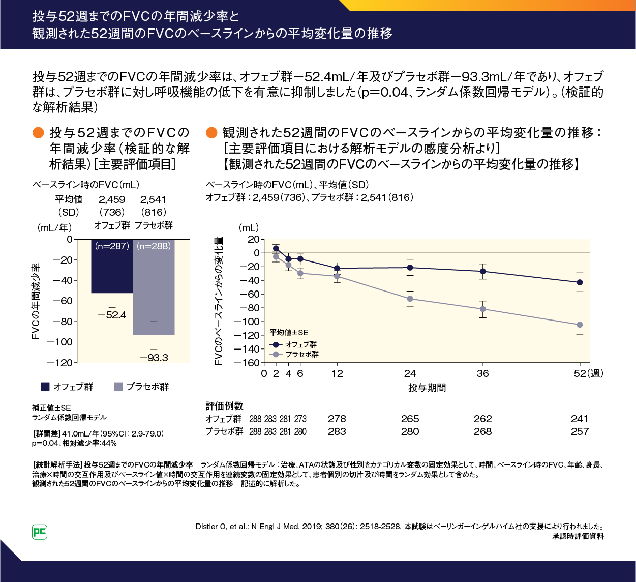 投与52週までのFVCの年間減少率(ランダム係数回帰モデル)は、オフェブ群-52.4mL/年、プラセボ群-93.3mL/年であり、オフェブ群は、プラセボ群に対してFVCの年間減少率の低下を統計学的に有意に抑制しました(群間差:41.0mL/年、95%CI: 2.9‒79.0、p=0.04)(検証的な解析結果)(図6)。