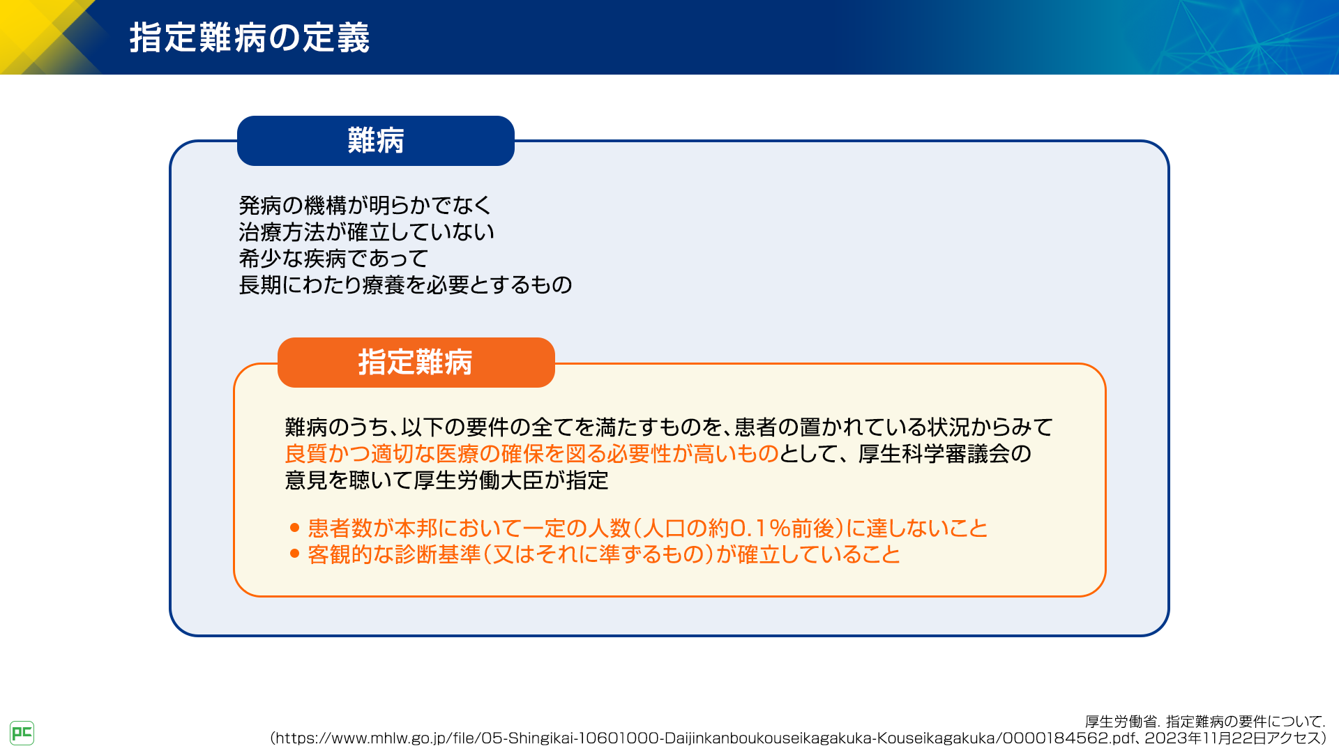 難病とは、「発病の機構が明らかでなく」「治療方法が確立していない」「希少な疾病であって」「長期にわたり療養を必要とするもの」を指します。