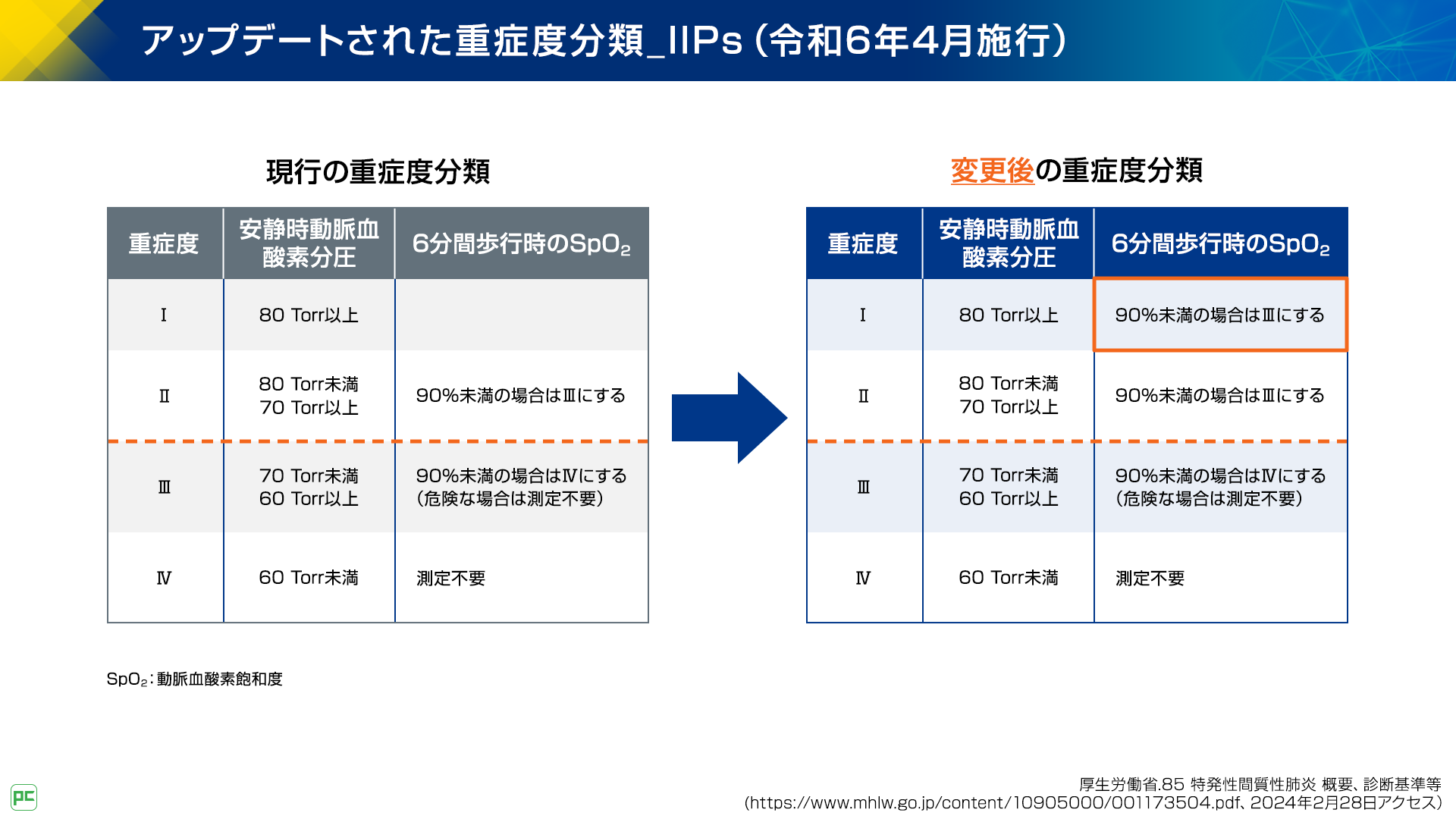 今回のアップデートにより、従来の基準では安静時PaO2の測定結果が重症度Ⅰ度だったために指定難病の医療費助成の対象外だった患者さんでも、新たな基準では6分間歩行時最低SpO2 90%未満の基準を満たせばⅢ度となり、医療費助成の申請が可能になります。予後不良で治療が必要なIIPs患者さんが適切にサポートされるようになることが期待されます。