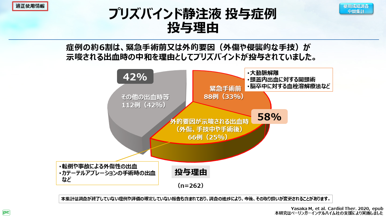 プラザキサ服用中の出血では、特異的中和剤プリズバインドが使用可能です。プリズバインドの使用成績中間集計結果では、プリズバインド投与理由の約6割が、緊急手術前または外的要因(外傷や侵襲的な手技)が示唆される出血時の中和でした。