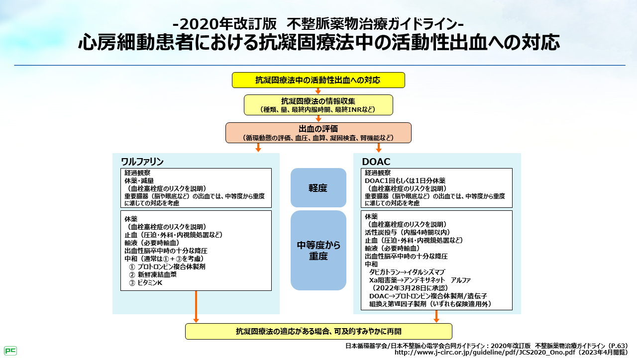 『2020年改訂版 不整脈薬物治療ガイドライン』にはAF患者における抗凝固療法中の活動性出血への対応が記載されています。DOAC、ワルファリンのいずれも、中等度から重度の出血では休薬や止血措置、循環動態の安定化を図り、中和も考慮します。早急にダビガトランの効果を是正する必要がある場合のイダルシズマブ(プリズバインド)の投与はクラスⅠ、エビデンスレベルBで推奨されています。