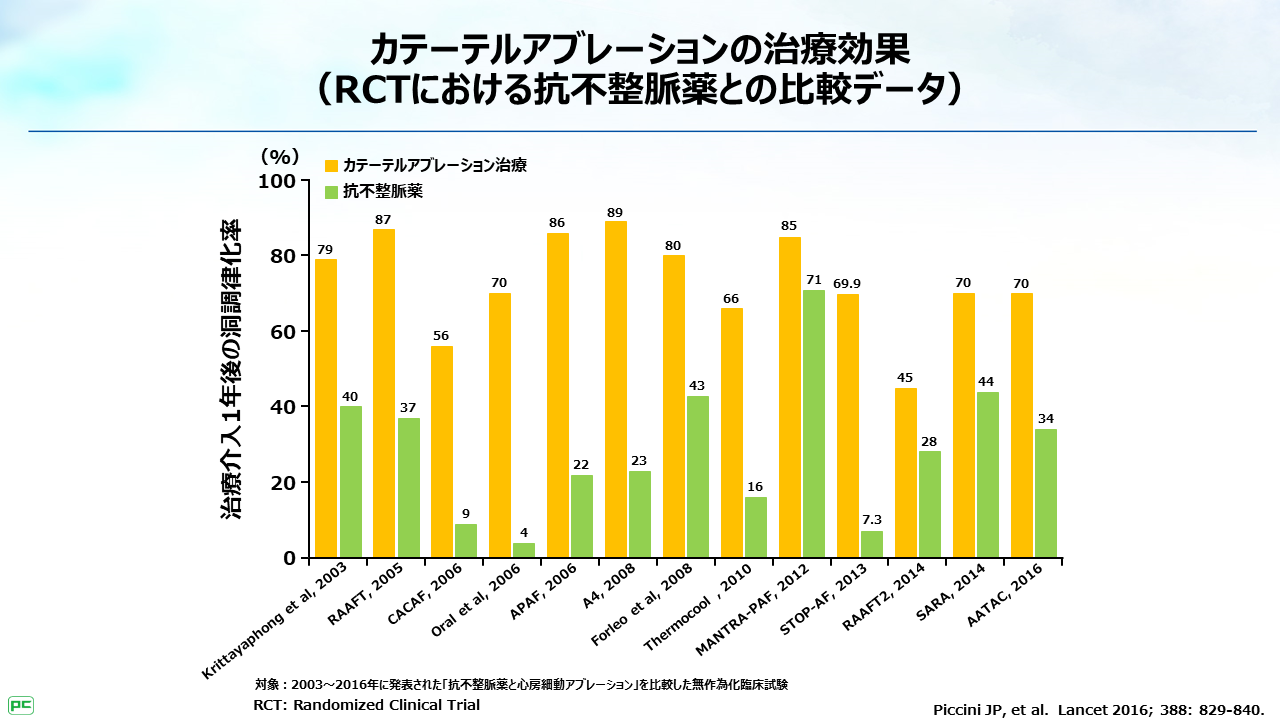 アブレーションは、その治療効果を抗不整脈薬と比較検証した、近年のランダム化比較試験のメタ解析の結果、治療介入1年後の洞調律化率が、抗不整脈薬による治療と比べ、高いことが示されています。