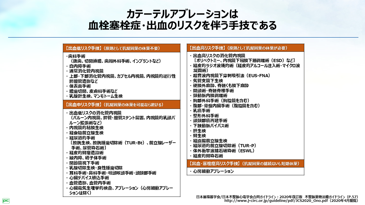 『2020年改訂版 不整脈薬物治療ガイドライン』でも、「心房細動アブレーション」は「周術期の適切な抗凝固療法がきわめて重要である」と記載されています。