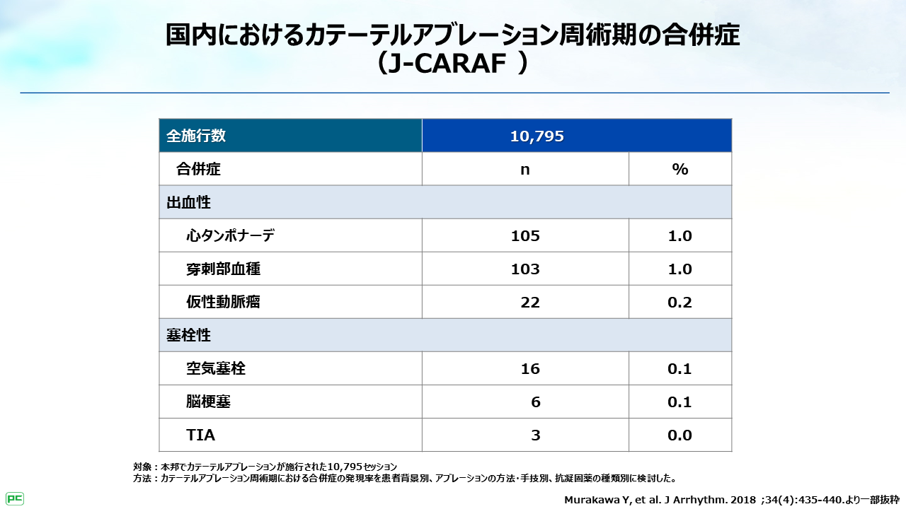 アブレーション施行時に注意すべき合併症に心タンポナーデなどの出血イベントや脳梗塞などの血栓塞栓イベントがあります。我が国で実施されたAFアブレーションの大規模観察調査であるJ-CARAFレジストリーでは、心タンポナーデなどの重篤な出血性合併症が約1%に報告されています。また、頻度は少ないものの患者さんの予後に影響する脳梗塞も報告されています。