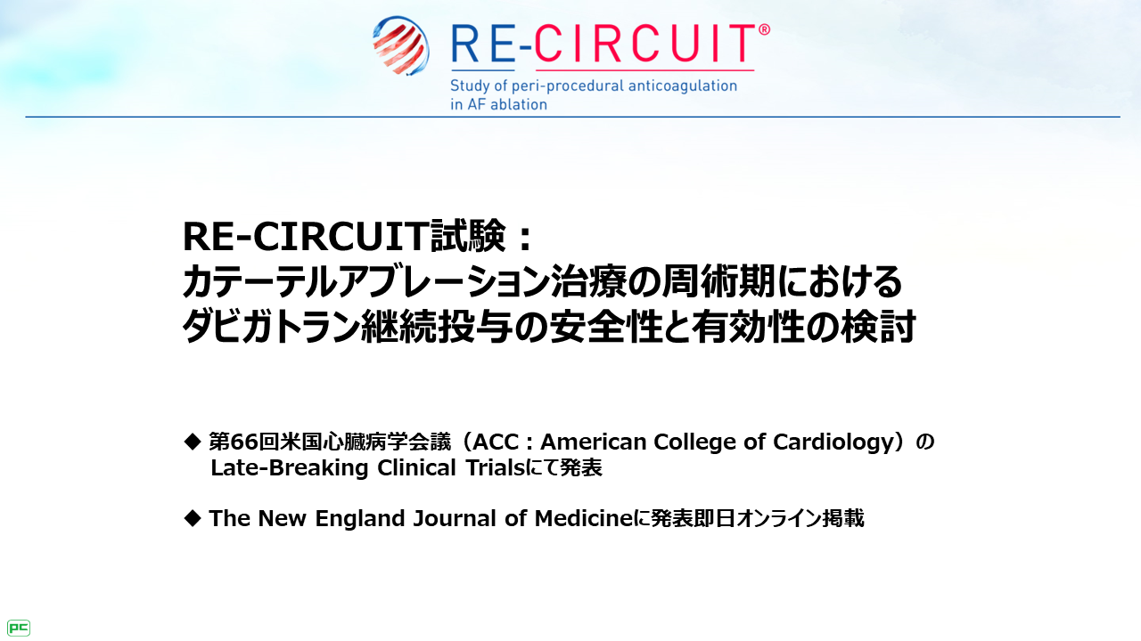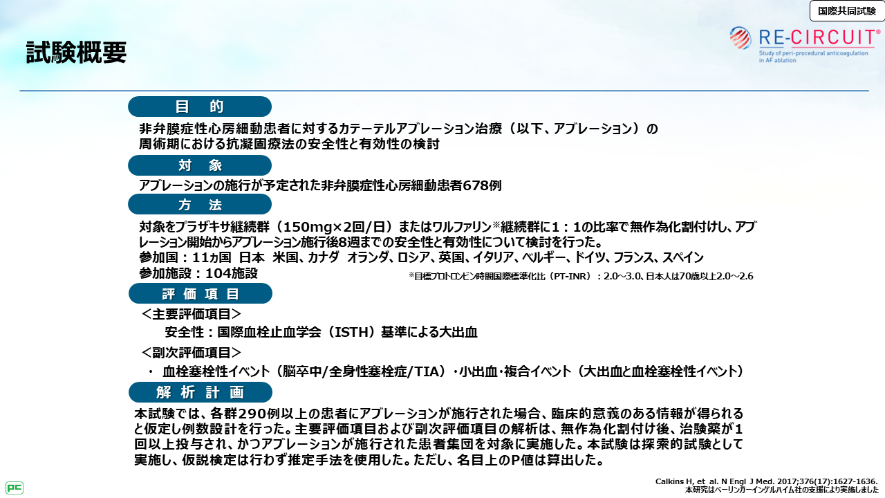 ここからは、ガイドラインの推奨の根拠となったプラザキサのRE-CIRCUIT試験を紹介します。RE-CIRCUIT試験では、アブレーションの施行が予定された非弁膜症性心房細動患者を対象に、プラザキサ継続群またはワルファリン継続群に割り付け、アブレーション開始から施行後8週までの安全性と有効性を検討しました。