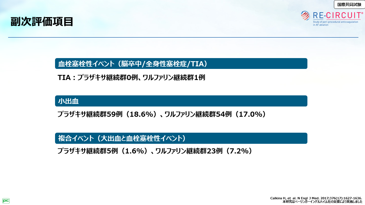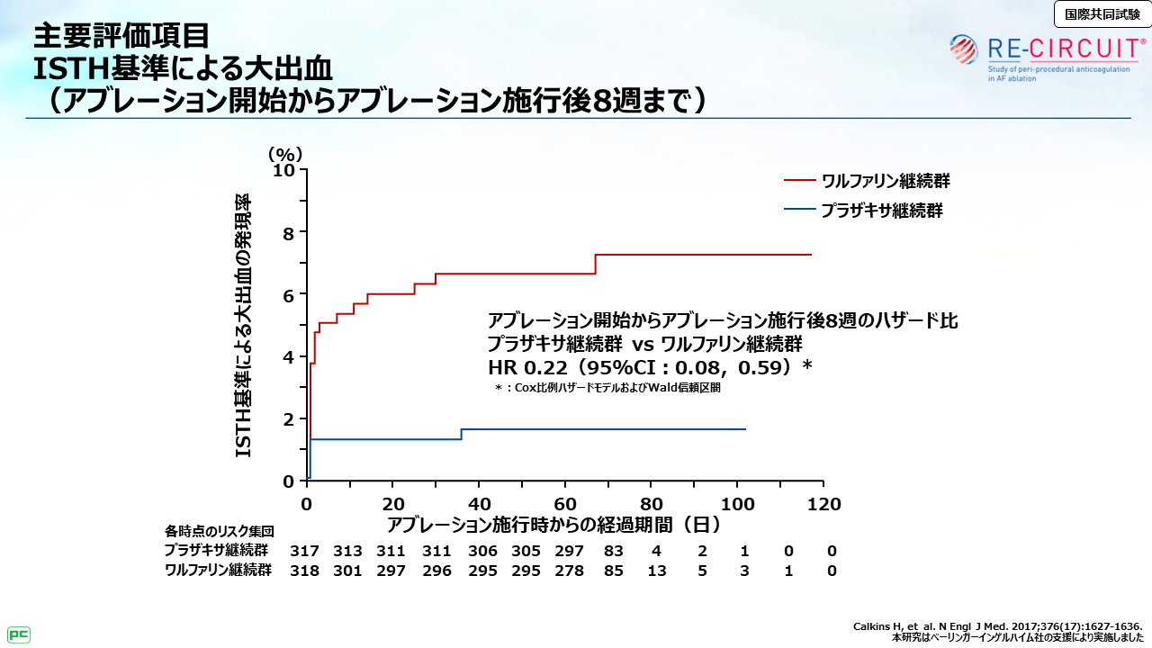 主要評価項目であるアブレーション施行から施行後8週におけるISTH基準による大出血の発現率は、ワルファリン継続群6.9%、プラザキサ継続群1.6%であり、有意にプラザキサ継続群で大出血が少なく、ハザード比は0.22でした。