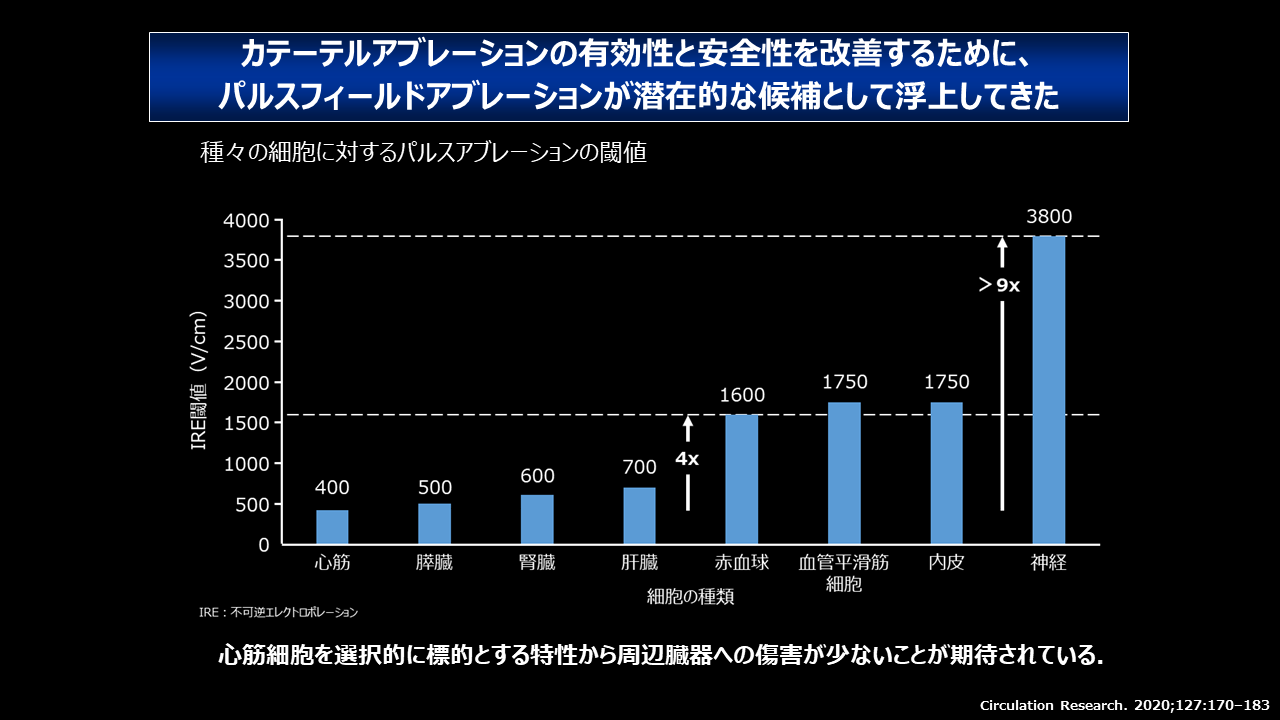 影響を受ける電界の強さは組織によって異なり、不可逆的な細胞膜の穿孔(irreversible electroporation, IRE)が生じる閾値は心筋細胞で低く、神経細胞や血管平滑筋細胞ではそれより高いことが明らかにされています6)。そのため、パルスフィールドアブレーションは心筋細胞を選択的に標的とすることができ、周辺臓器への障害が少ないことが期待されています。