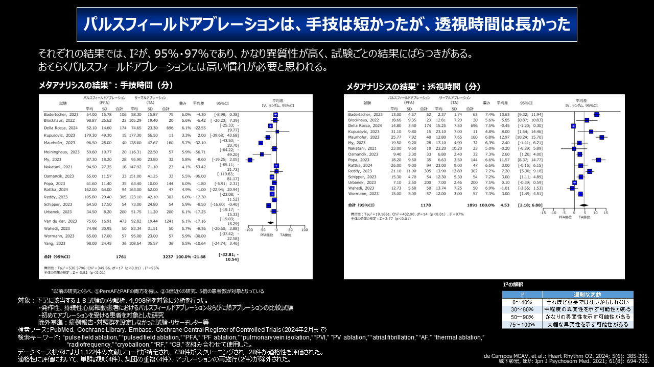 一般的に75%以上のI2は異質性が高いと解釈されます8)。つまり、この解析では試験ごとの結果のばらつきが大きいことが示されており、このことから、パルスフィールドアブレーションで手技時間や透視時間の短縮を得るためには、手技に対する高度な習熟が必要と考えられます。