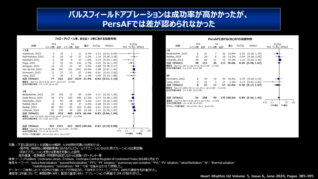 続いて、治療成功率は、1年未満・1年後とも差はなかったものの、両者を統合した解析ではパルスフィールドアブレーションの方が高い結果となりました。